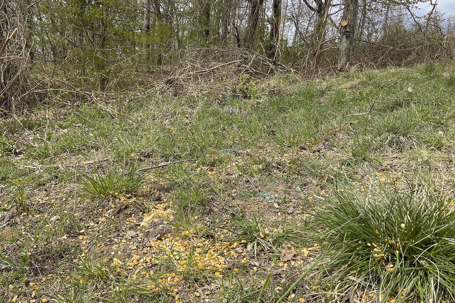 fidelizzanti vitexIn via preliminare ho individuato un’area di ecotono (l’ambiente di transizione tra prato e bosco) posizionata a circa 100 metri da un punto di sparo attrezzato per l’occasione e dal quale sono in grado di dominare anche una sorgente, molto frequentata. Qui ho spalmato il catrame vegetale sul tronco di un albero, mediante una spatola, così da creare un grattatoio; le caratteristiche naturali del catrame vegetale gli conferiscono una forte azione antiparassitaria. A pochi metri ho successivamente preparato la governa disperdendo circa mezzo chilogrammo di sale su un’area di un metro quadrato e, nelle vicinanze, il chilogrammo consentito dalla legge di mais aromatizzato con il Fishvit (mescolato in percentuale del 2% sul peso del mais qualche giorno prima dell’utilizzo).