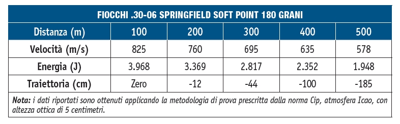 Fiocchi soft point 180 grani calibro .30-06 Springfield: la tabella balistica