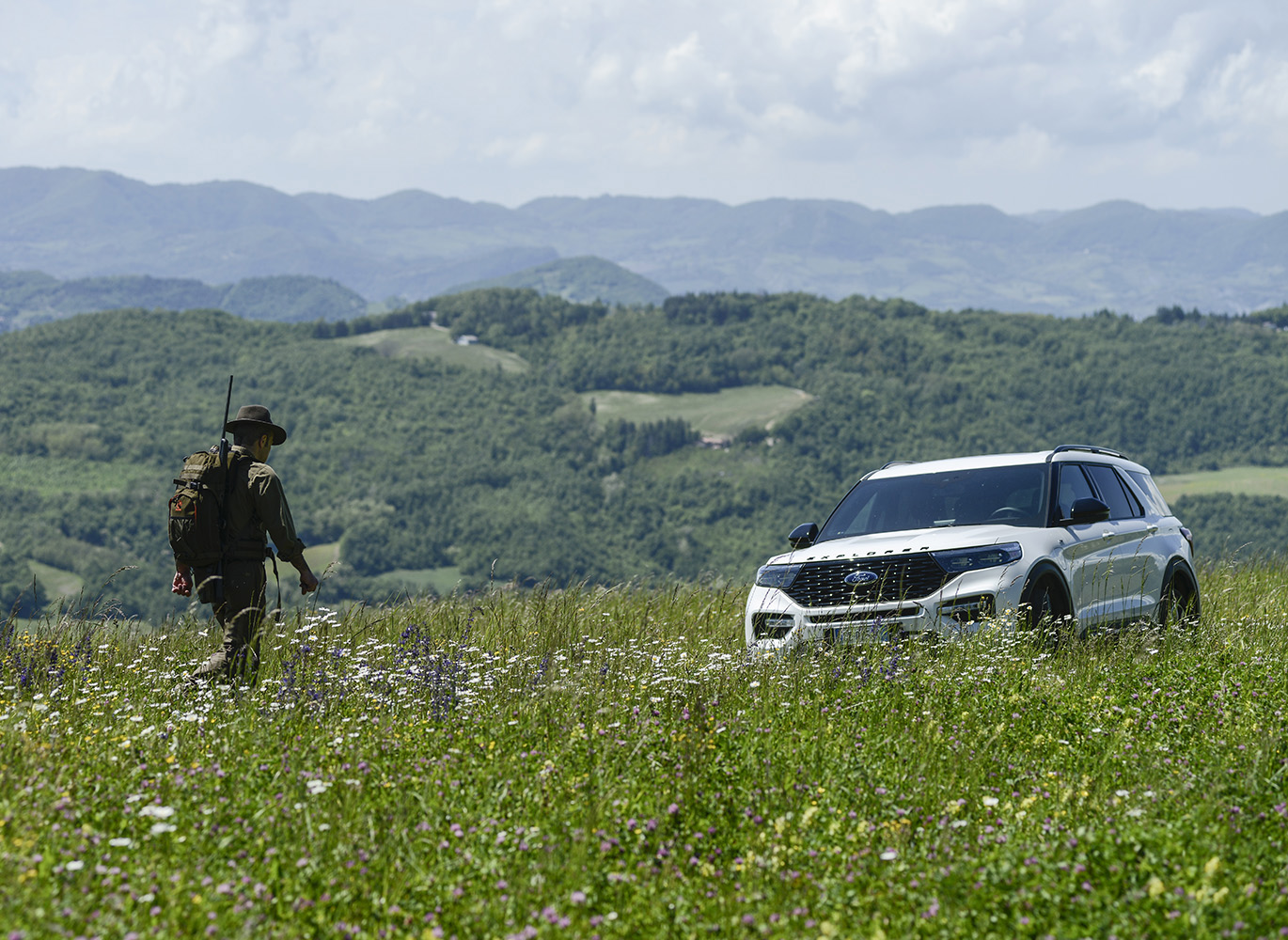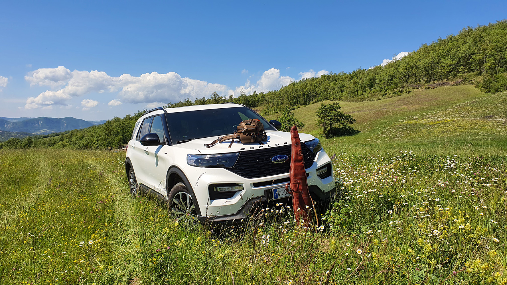 Questa volta abbiamo un compagno particolare nella nostra giornata di caccia: a condurci all’appuntamento è infatti un gigante americano, il Ford Explorer Plug-in Hybrid, un Suv made in Usa (dove è giunto alla sesta generazione) che vanta ben sette posti e una lunghezza di oltre 5 metri. Un limite è chiaro fin dall’inizio: non ci porterà sui sentieri dove solo le piccole fuoristrada riescono a fatica ad arrivare. Poco male: useremo le nostre gambe, ma solo per l’ultimo tratto. Perché finché lo spazio lo consente l’Explorer sa destreggiarsi, forte della grande potenza del suo 3 litri V6 abbinato a un motore elettrico alimentato da un pacco batteria da 13,6 kWh, per un totale di ben 457 cv e 825 Nm di coppia massima.