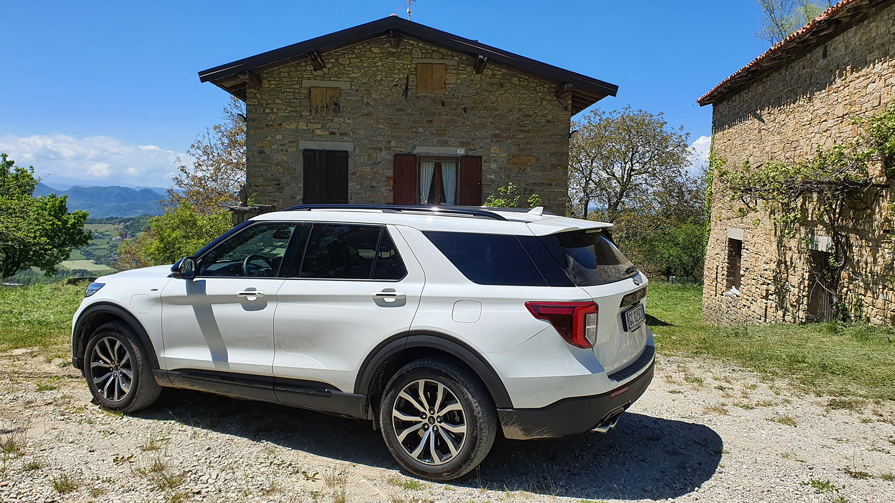 Mettiamo in moto senza però sentire nulla: a bassa velocità lavora l’elettrico. Con la batteria completamente carica, l’Explorer può percorrere fino a 40 km con la sola alimentazione elettrica. Per caricare completamente la batteria da una fonte di alimentazione esterna a 230 volt occorrono meno di 6 ore; mentre tramite il Ford Connected Wallbox o presso una stazione di ricarica pubblica sono necessarie poco più di 4 ore. Dopo qualche centinaio di metri pigiamo a fondo il pedale: il V6 si fa sentire con un sound che conquista anche se l’abitacolo è ben insonorizzato.