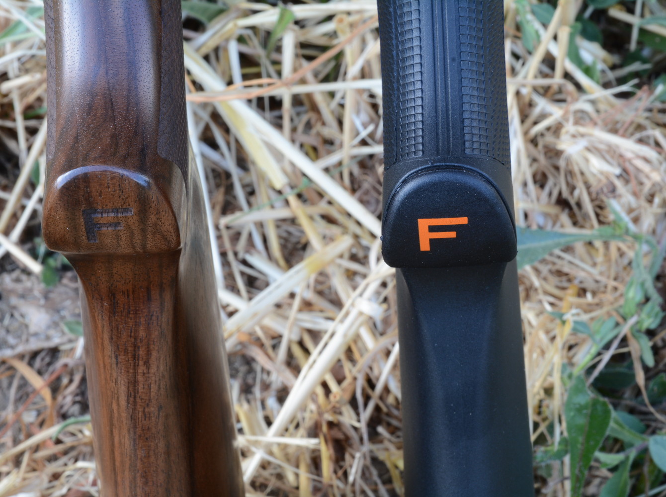 Rovesciando i due fucili si nota l’elevatore (fessurato in entrambi i modelli), che consente un’introduzione piuttosto agevole delle cartucce nel tubo serbatoio; non ci sono scivoli o parti più allargate o smussate. La F di Franchi troneggia sulla coccia, laserata nel legno nella versione in calibro 12 Wood ed evidenziata con una colorazione rossa nella versione in calibro 20 Black Synt. In questo modo ogni fucile Franchi riposto in posizione inerme in rastrelliera non mancherà di farsi notare come appartenente alla famiglia.