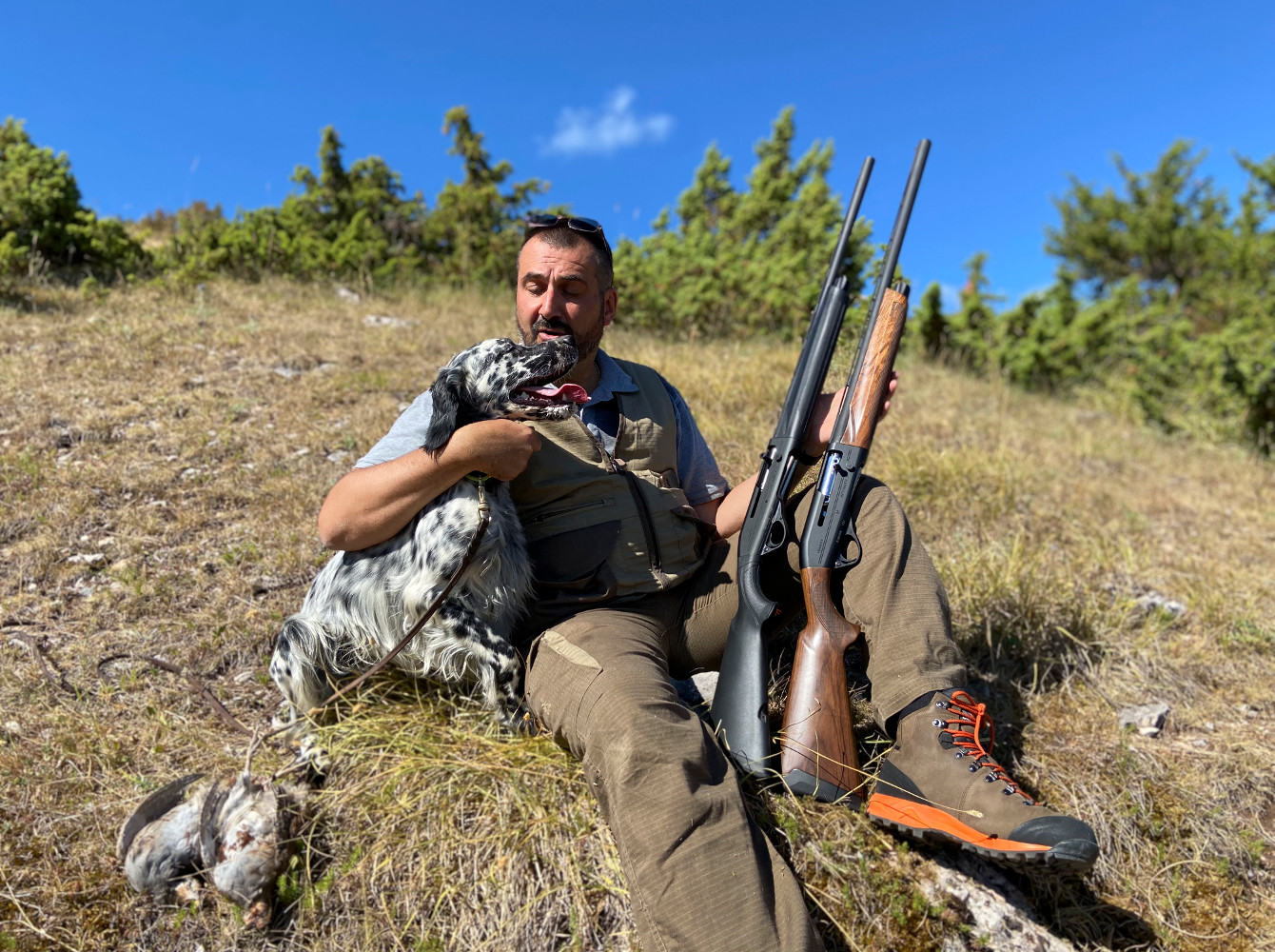 Poco tempo per le considerazioni: i cani fanno bene (una splendida ferma e consenso) nei pressi di una porzione di terreno coperta da vegetazione. Non ci vuole poi molto a capire che lì si possono nascondere le starne. E infatti quando siamo in posizione li accompagniamo lentamente a rompere la ferma sino a che un frullo di 5-6 animali si sparpaglia in varie direzioni. Tutto quello che pensavo svanisce in un attimo e l’istinto ha la meglio; incanno la prima starna e sparo, la sbaglio di prima canna e la colpisco di seconda, facendo in tempo a fermare anche un secondo animale con il terzo colpo.