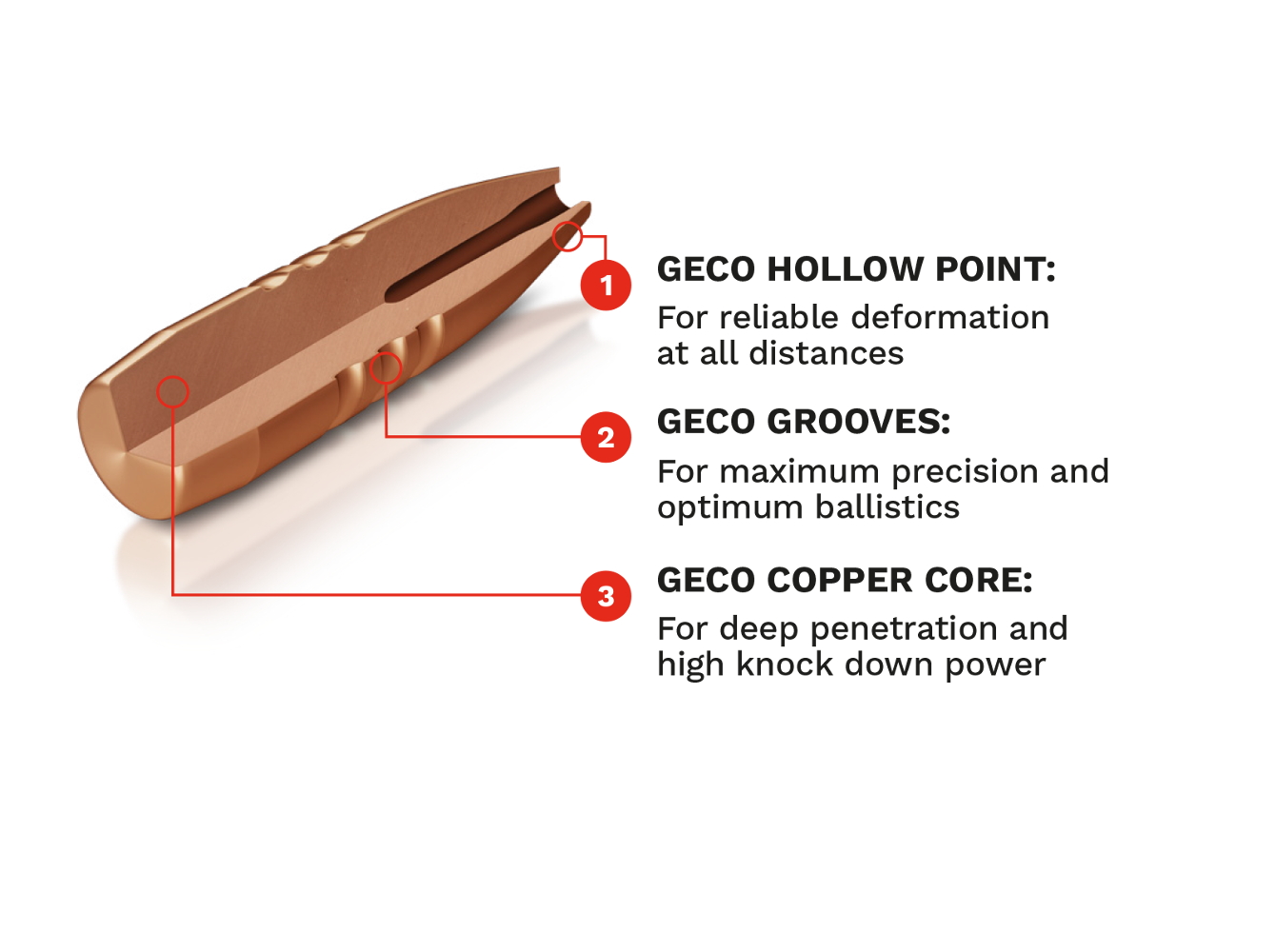 Le scanalature Geco Grooves amplificano precisione e performance balistiche; Geco (gruppo Ruag, come Rws che ha lanciato le munizioni Driven Hunt per la braccata) assicura comunque danni minimi alla carne del selvatico.