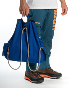 La parte posteriore del gilet ospita un grande carniere (lavabile), foderato con nylon leggero, completamente staccabile e chiuso lateralmente da due robustissime cerniere. Ed ecco una soluzione davvero innovativa: il capo, una volta ripiegato, si trasforma in uno zaino; basta un semplice guinzaglio, passante nei tre occhielli posizionati alle estremità. Posizionata sulla cacciatora vi è un’ulteriore tasca con in cima una robusta maniglia di stoffa che serve per trasportare il gilet, una volta composto, come fosse una borsa.