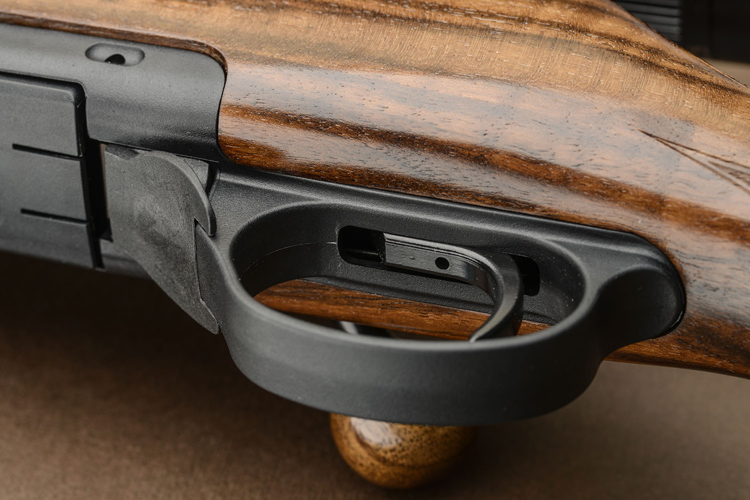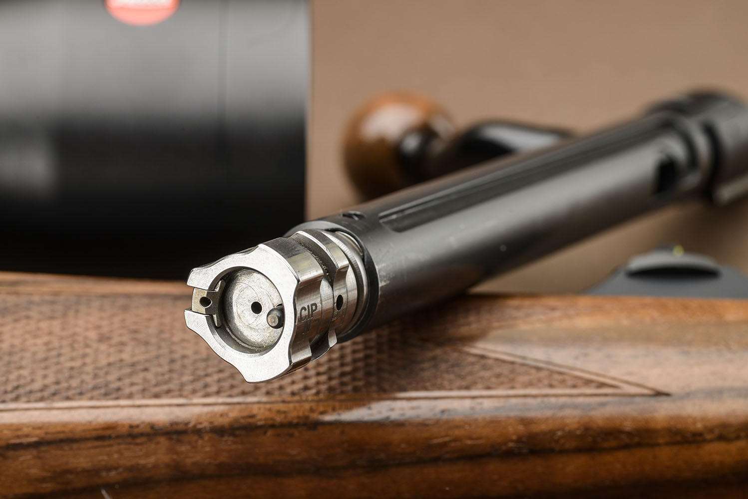 Minimo comun denominatore del sistema Jaeger 10 è l’otturatore a sei tenoni di costruzione molto robusta; è infatti dimensionato per i calibri più prestanti disponibili. Le sei alette sono posizionate in una doppia corona che consente lo svincolo del componete mediante una rotazione di 60°. Un valore contenuto che permette di ipotizzare l’impiego anche in condizioni dinamiche. Niente a che vedere con la velocità della ripetizione manuale tipica delle carabine straight-pull ma devo rilevare come, sempre di più, il sistema a otturatore girevole-scorrevole riscuote interesse anche tra i cacciatori in battuta; specie in Nord Europa, dove si insidia l’alce o il cinghiale con mute di cani molto contenute di numero. Il manubrio dell’otturatore porta un pomello in essenza pregiata che conferisce eleganza.
