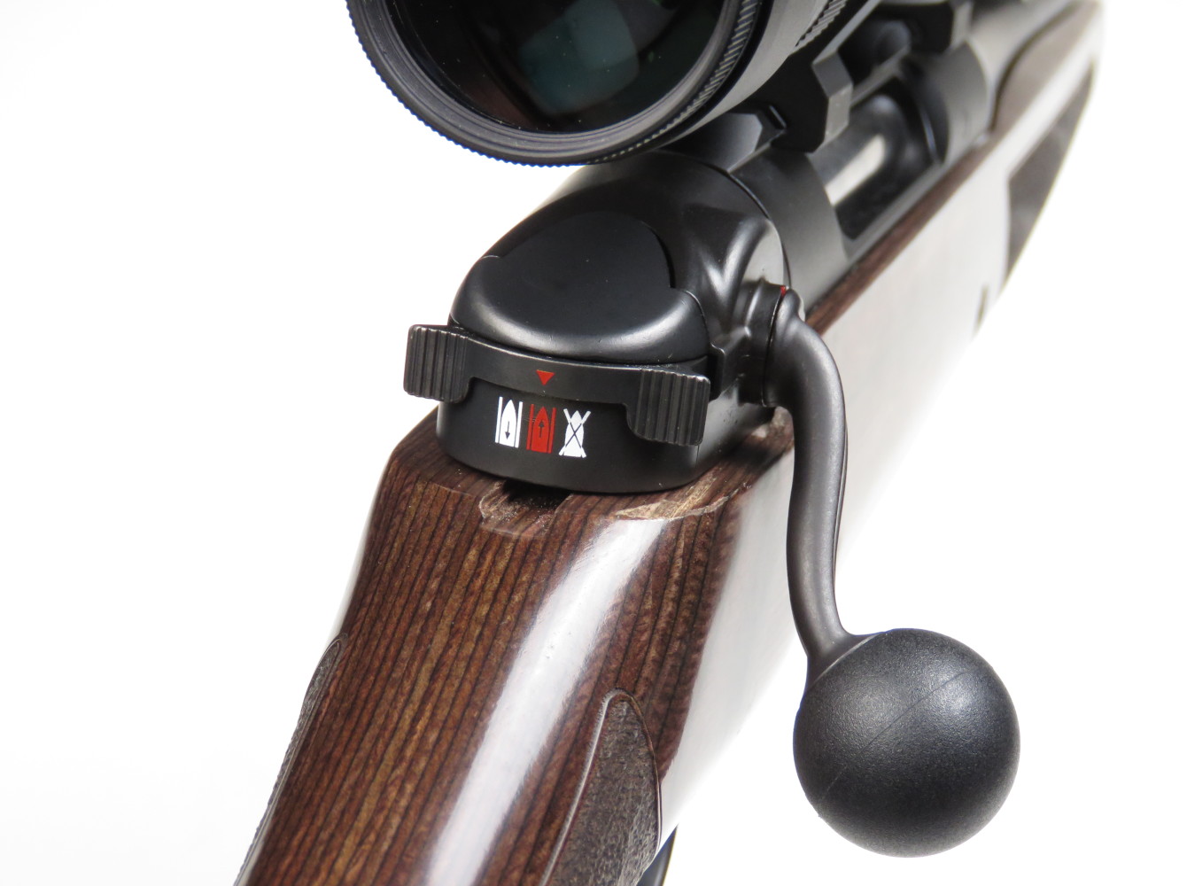 - Sicura: integrata nel manubrio di armamento; ghiera manuale sul noce dell’otturatore