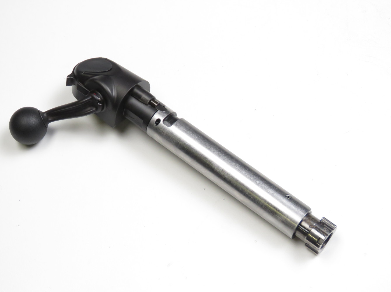 Il manubrio, in polimero, ha un pomo sferico di 25 millimetri e ha due posizioni: la sua posizione di trasporto, contraddistinta da un puntino bianco sulla sommità del fulcro di rotazione, è quella in cui il manubrio si trova con una inclinazione all’indietro di circa 45°. In questa posizione, l’otturatore è bloccato e lo scatto è inibito, anche perché la molla del percussore risulta in posizione di riposo.