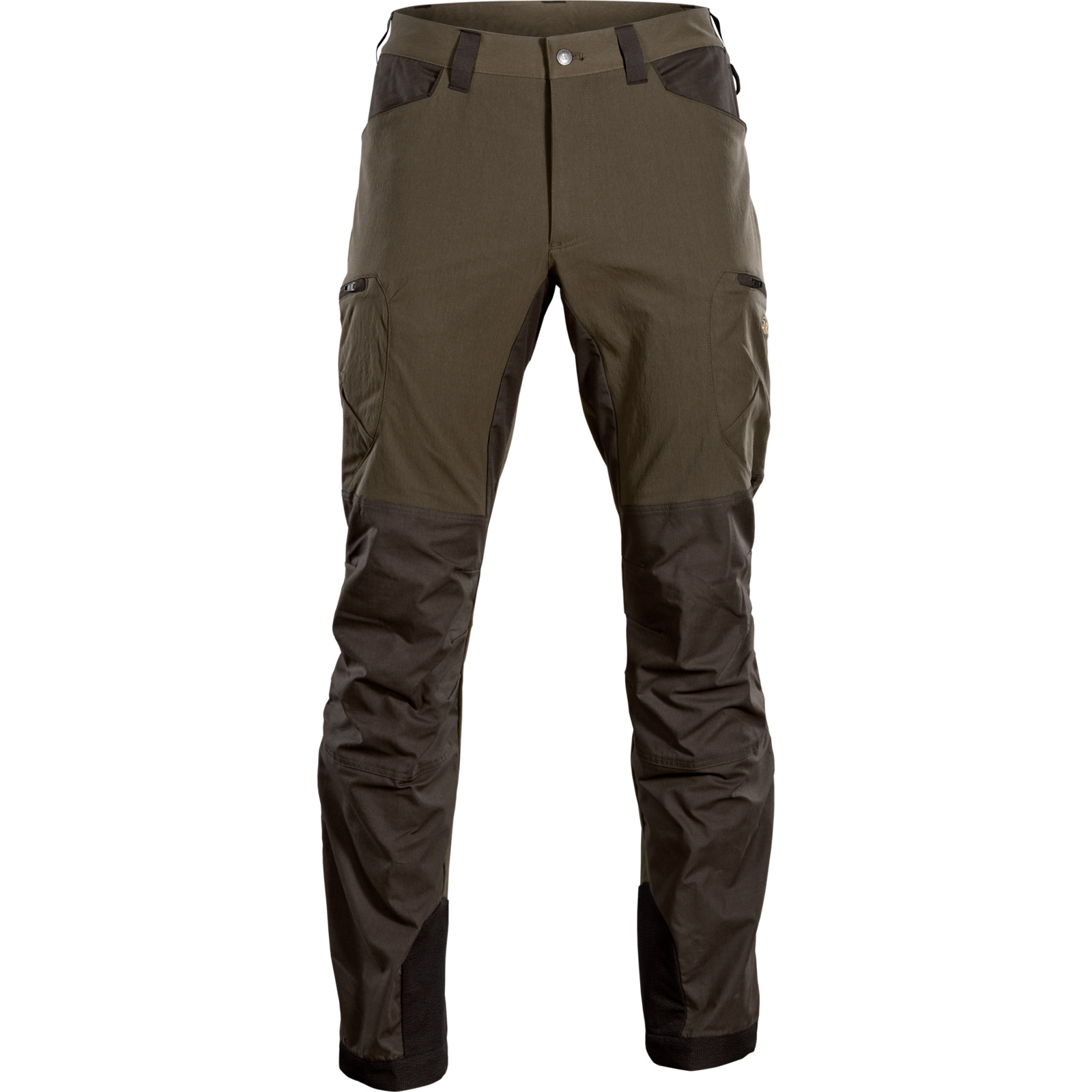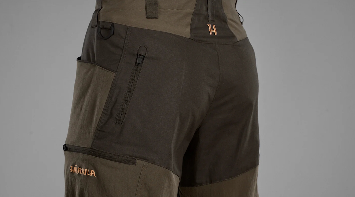 Härkila pantaloni RagnarI Ragnar sono attrezzati con due tasche frontali. Le due tasche sulle cosce sono dotate di cerniere per mantenere il contenuto al sicuro durante il movimento; quella sulla coscia destra contiene un portacartucce per quattro cartucce.