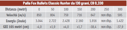 La Fox Bullets, giovane realtà slovena, propone la propria palla lead free modello Classic Hunter da 130 grani (8,4 grammi) che, un coefficiente balistico di 0,330, fa registrare alla bocca una velocità di 850 m/s e un’energia di 3.044 Joule. A 100 metri la velocità si riduce a 759 m/s, che diventano 647 m/s a 200 metri e 595 m/s a 300 metri. L’energia a 100 metri risulta essere pari a 2.428 Joule, a 200 metri pari a 1.916 Joule per calare a 1.422 Joule a 300 metri. Supponendo di aver tarato la propria arma con +4,0 centimetri a 100 metri, ossia un GEE di 165 metri, il calo a 200 metri sarà di -18,4 centimetri per diventare -37,9 centimetri a 300 metri.