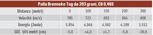 La Brenneke dispone di una soluzione storica, con la famosissima palla Tug, acronimo di Torpedo Universal Geschoss, dal peso di 293 grani (19 grammi) e un coefficiente balistico di 0,465. La tabella balistica fa registrare una velocità alla bocca di 785 m/s e un’energia pari a 5.854 Joule. Questi valori calano a 723 m/s e 4.966 Joule a 100 metri, 664 m/s e 4.189 Joule a 200 metri, 608 m/s e 3.512 Joule a 300 metri. Tarando l’arma a 100 metri con un alzo di +4,0 cm (GEE a 165 metri), a 200 metri il calo sarà di -5,8 cm e a 300 metri di -39,9 centimetri.