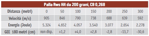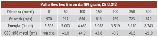 La Rws, che in catalogo dispone di una soluzione simile in tutto e per tutto a quanto proposto da Brenneke, ha come alternativa un munizionamento nel quale utilizza una palla di propria concezione Evo Green, lead free, da 184 grani (11,9 grammi) e un coefficiente balistico di 0,312. Il peso di palla più leggero permette di misurare alla bocca una velocità di 970 m/s e un’energia di 5.598 Joule. A 100 metri la velocità residua sarà di 866 m/s, a 200 metri di 769 m/s, a 300 metri di 679 m/s; consequenzialmente anche l’energia si ridurrà a 4.462 Joule a 100m, 3.519 a 200 metri e 2.743 a 300 metri. Anche in questo caso, tarando la carabina a 100 metri (GEE a 198 metri) a 200 metri il calo sarà di -0,2 centimetri e di 21,0 centimetri a 300 metri.