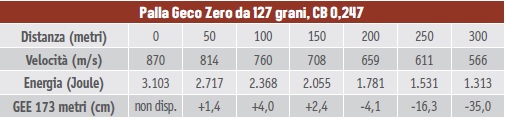 Anche la Geco, azienda del gruppo Ruag, propone una palla lead free modello Zero da 127 grani (8,2 grammi) con un coefficiente balistico di 0,247. Alla bocca la velocità risulta essere di 870 m/s, l’energia 3.103 Joule. I valori di velocità ed energia risultano essere 760 m/s e 2.368 Joule a 100 metri, 659 m/s e 1.781 Joule a 200 metri e 566 m/s e 1.313 Joule a 300 metri. Tarando l’arma a 100 metri con +4,0 centimetri (GEE di 173 metri), il calo a 200 metri sarà di -4,1 centimetri che diventano -35,0 centimetri a 300 metri.