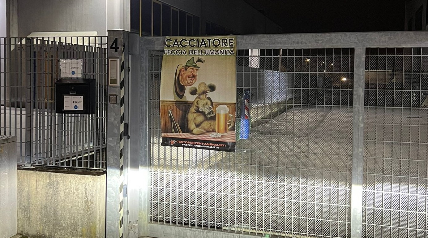 Il movimento Centopercentoanimalisti ha appeso un manifesto minaccioso davanti alla sede della società che organizza Eos ’22.