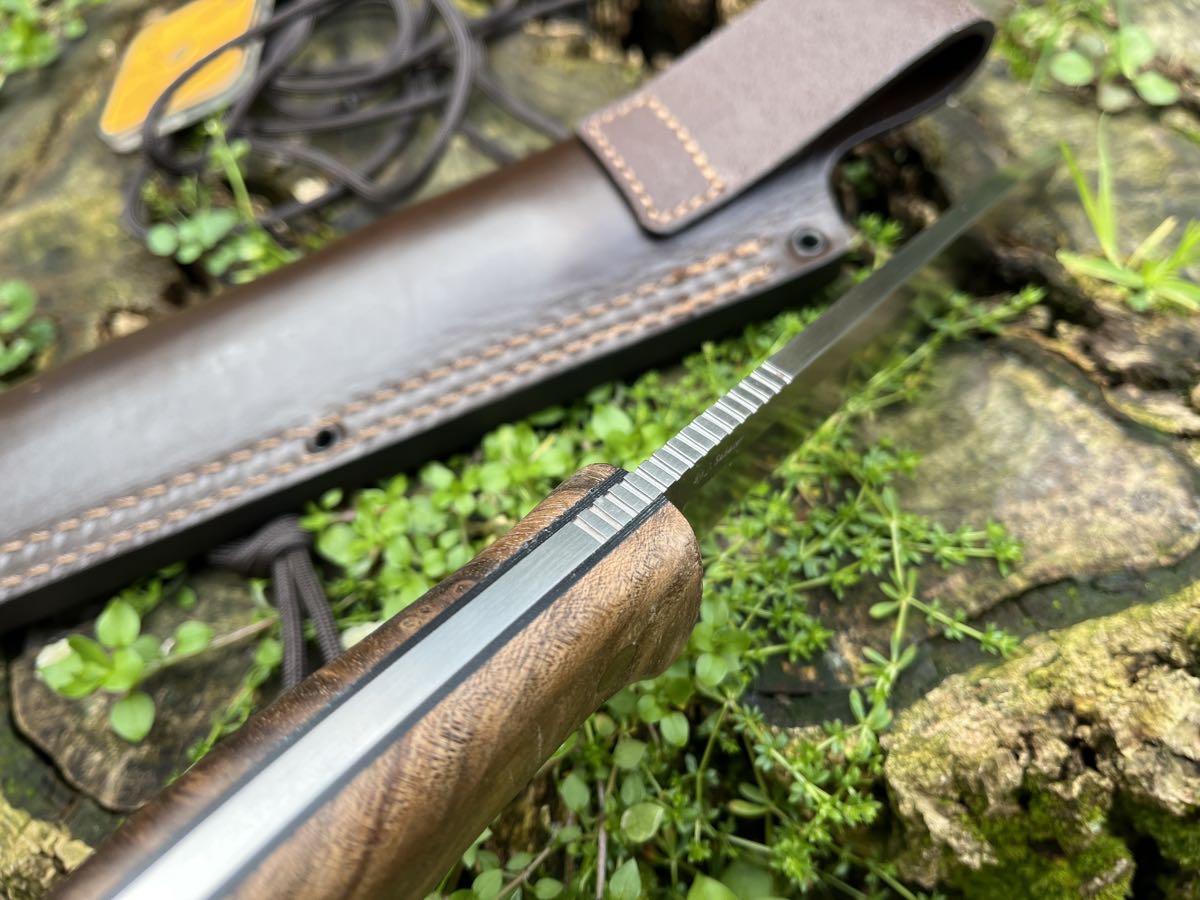 Nodo centrale per un coltello che deve lavorare a lungo è la lama. Il Nomad 6.5”, che ha una costruzione full tang con codolo esposto, dispone di un lama lunga 165 mm realizzata – come si legge sul lato sinistro – in acciaio Böhler N695, diversa nomenclatura per il 440C, tra gli acciai inossidabili più popolari tra i coltellinai: è un acciaio martensitico al cromo ad alto tenore di carbonio, progettato per abbinare proprietà inossidabili alla massima durezza.