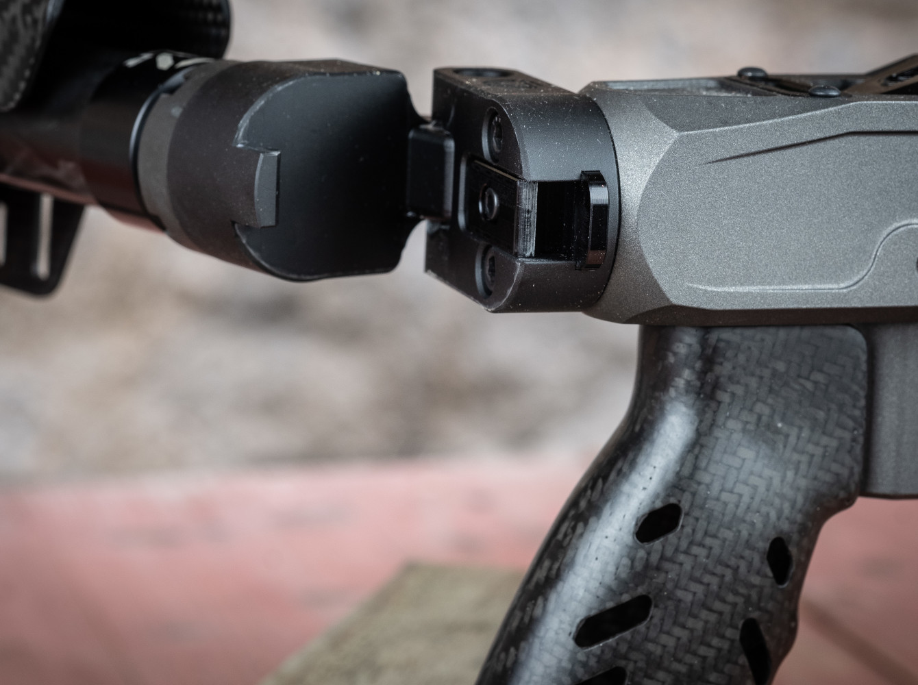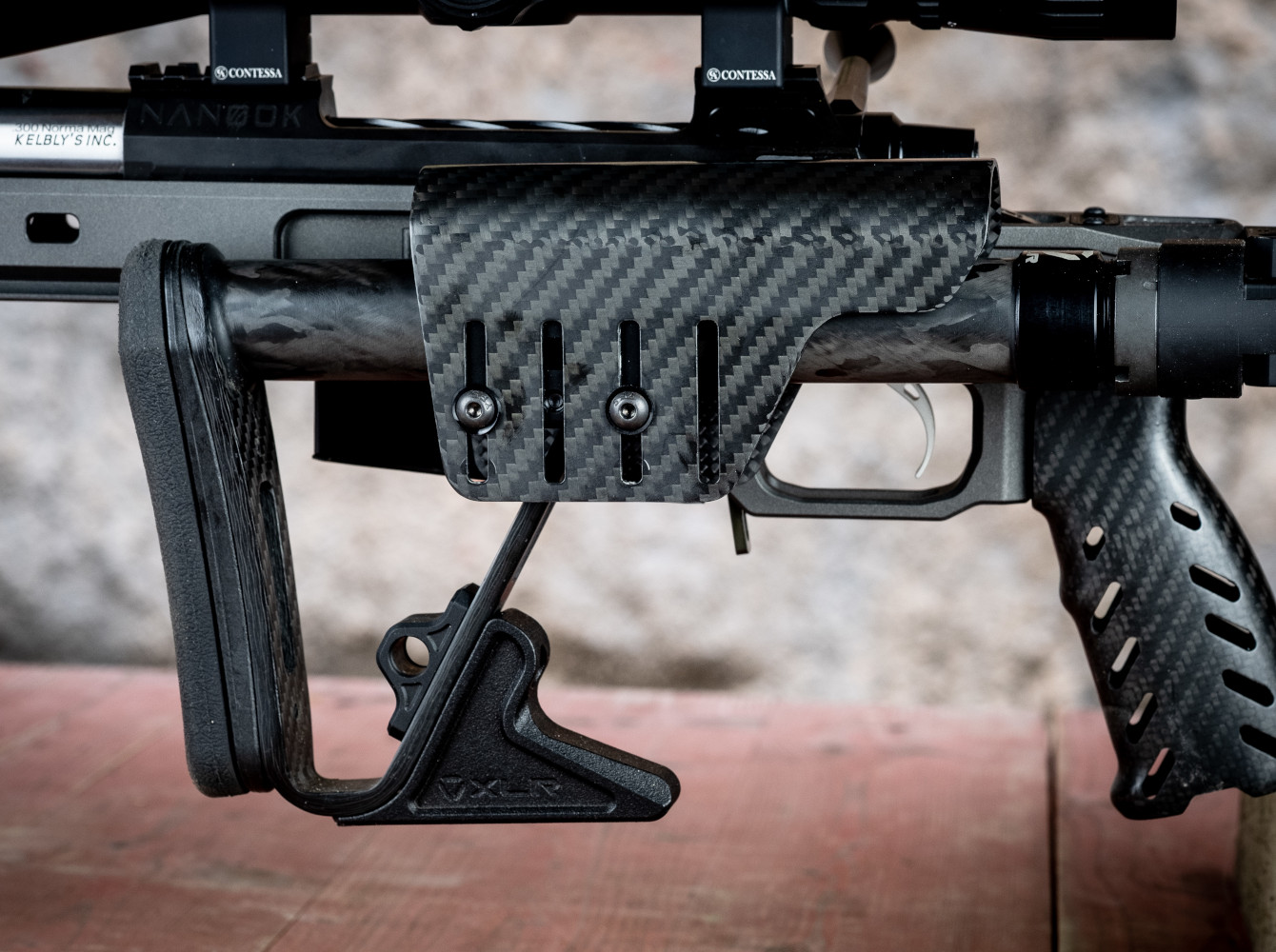 Le altre componenti per le quali è stato fatto ricorso alla fibra di carbonio sono l’impugnatura e il calcio. Nel primo caso Kelbly ha scelto un profilo Ar15 compatibile, caratterizzato da dieci piccole fresature per lato, per ridurre ulteriormente il peso; nel secondo sono in carbonio sia il buttstock sia l’appoggiaguancia, regolabile in altezza. Il calcio, che può essere ribaltato sul lato sinistro dello chassis tramite una levetta posta sul lato destro, in prossima dell’attacco tra calcio e chassis, è dotato anche morbido calciolo in gomma.