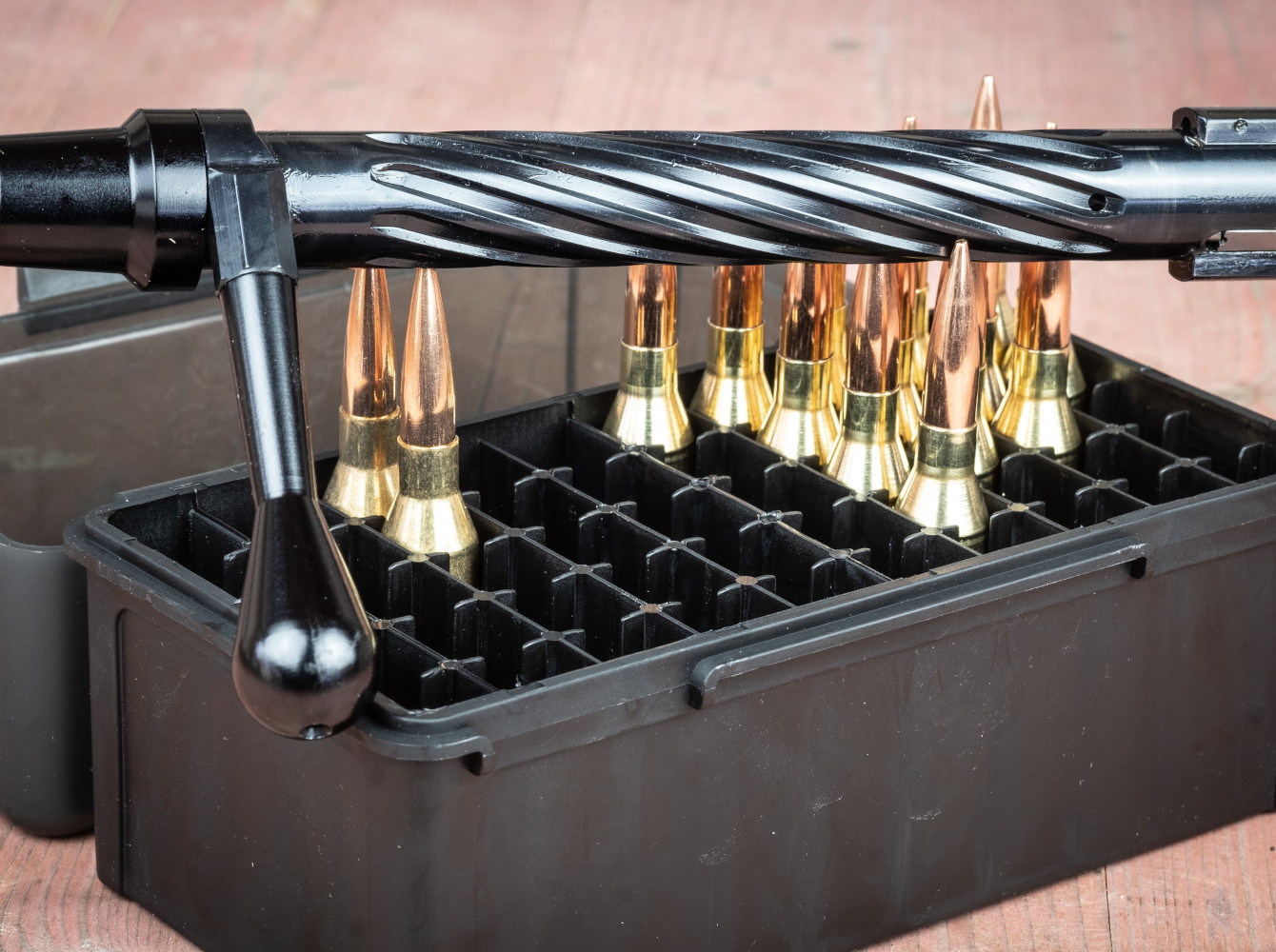 I progettisti Kelbly hanno messo in campo un’azione nuova di pacca, che poi dà il nome alla carabina: Nanook Long. Si tratta di un’azione in configurazione a ponti aperti, ricavata da acciaio 416R, con finitura nitrurata nera che aumenta la resistenza e migliora la scorrevolezza dell’otturatore, sui quali sono stati ricavati due spezzoni di slitta Picatinny inclinati di 35 moa.