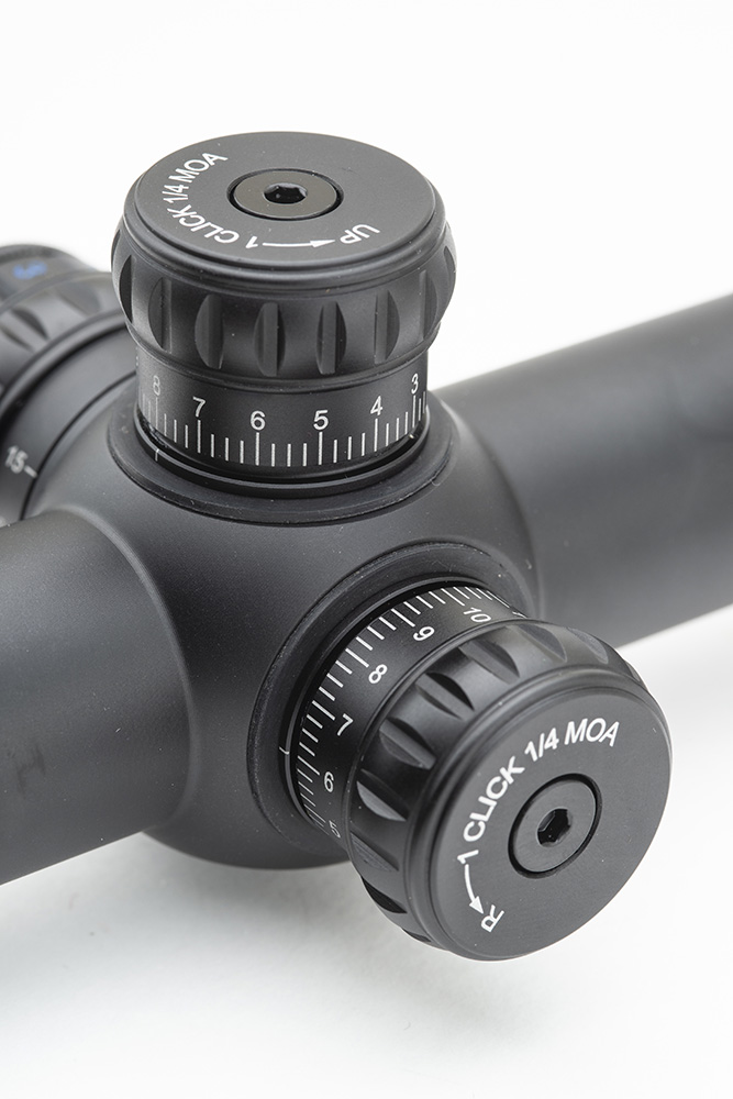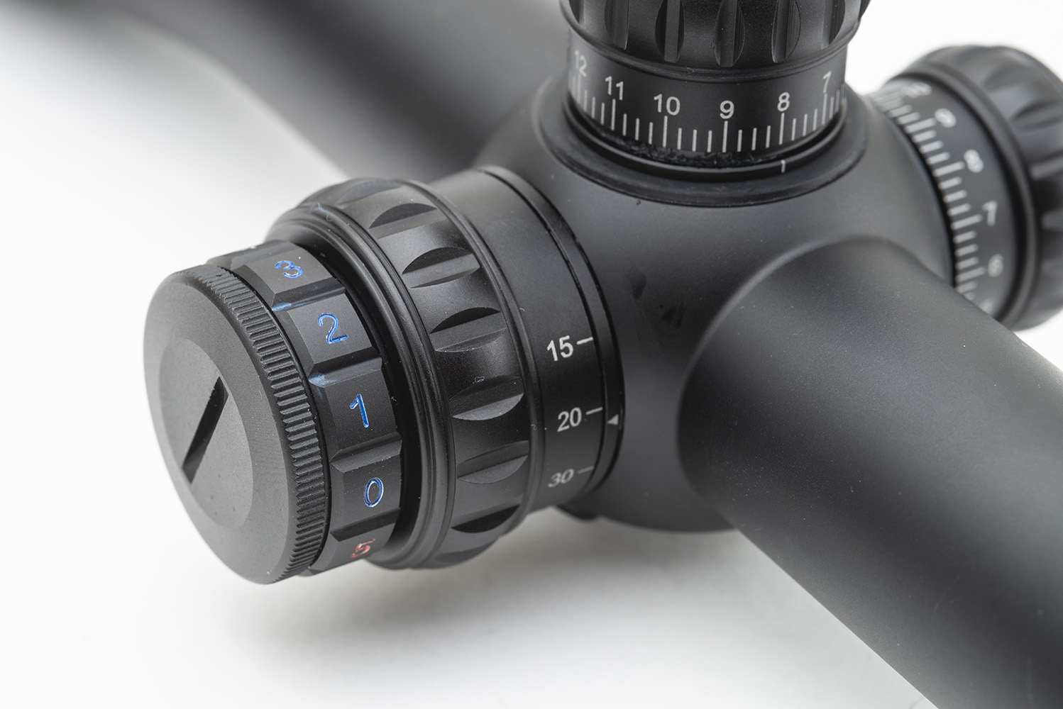 Oltre a fornire la ghiera per la regolazione dell’intensità luminosa e a contenere la batteria che alimenta l’elettronica, un comune accumulatore a bottone, la torretta sinistra porta anche il comando per la regolazione della parallasse. Gli indici incisi indicano un campo di regolazione tra le 10 e le 1.000 yard. Si tratta di un comando che mi piace vedere su tutte le ottiche, anche quelle economiche; indispensabile su prodotti dalla focale estesa come quello in oggetto, è comunque essenziale in ogni strumento di puntamento in quanto favorisce una chiara visione del bersaglio e quella sicurezza psicologica che va sempre ricercata nello sforzo di caccia, di per sé aleatorio. Le torrette di alzo e deriva sono del tipo esposto, azzerabili e bloccabili.