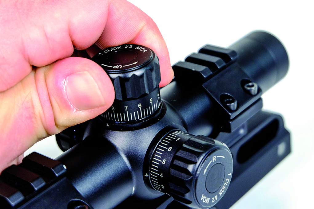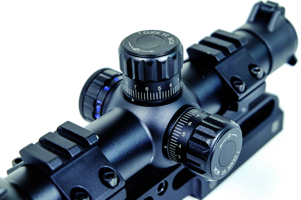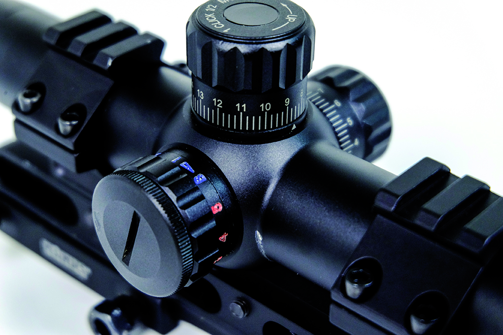 Il corpo è macchinato da tubi di solido alluminio e presenta un diametro esterno standard di 30 millimetri. Ben raccordate le torrette, che permettono di agire sul reticolo Circle-dot illuminato di casa Konus a passi di mezzo Moa, come conviene a un prodotto pensato per distanze comunque contenute; il campo di regolazione prevede 180 click (2,7 metri a 100 metri). Il reticolo è posto sul secondo piano focale e illuminabile in rosso e in blu ruotando il reostato; per ciascuna colorazione sono previsti cinque livelli di intensità. Le torrette sono azzerabili. Molto buone le lenti fully multicoated che presentano trattamenti multipli per enfatizzare il transito della luce e ridurre le aberrazioni tipiche dell’ottica da puntamento. Lo schema ottico favorisce un’estrazione pupillare comoda, compresa tra 95 e 90 millimetri.