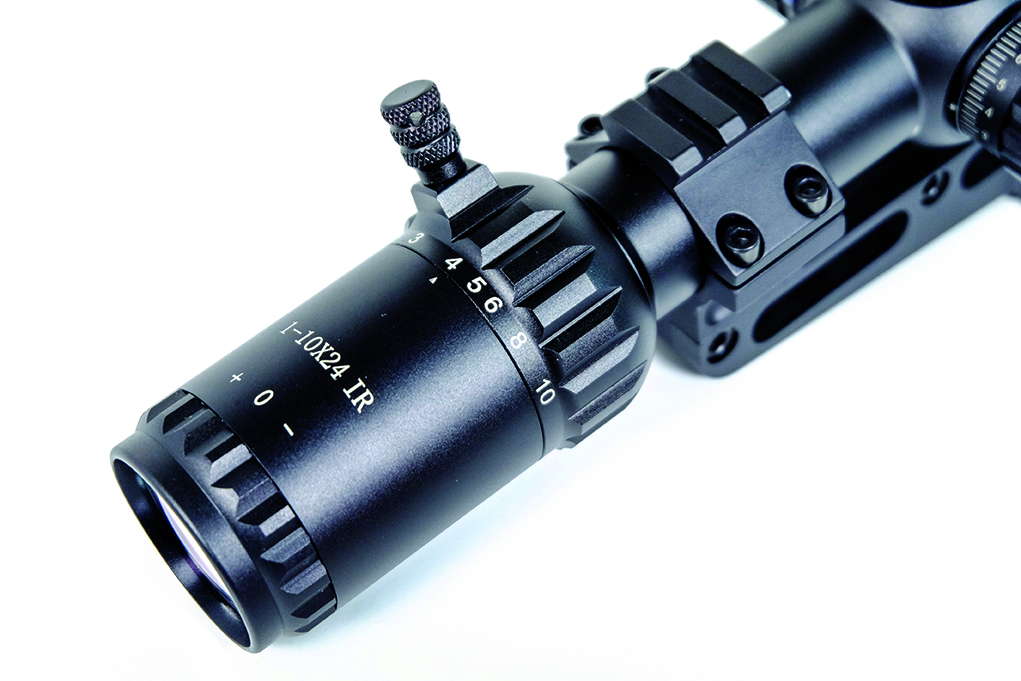 La si può a buona ragione definire un’ottica ibrida. Il cannocchiale Konus Event in prova parrebbe, a prima vista, uno strumento da battuta; dispone infatti di un generoso oculare ma è privo della campana dell’obiettivo, caratteristica che contraddistingue gli strumenti pensati per la caccia di selezione. Ma il rapporto d’ingrandimento di 1:10 ne fa un oggetto flessibilissimo. Adatto sì alla battuta al cinghiale ma – grazie ai suoi 10 ingrandimenti – pure a qualche uscita in selezione, magari proprio al suide, in contesti diurni. Limitato solo dal diametro della lente frontale, che con i suoi 24 millimetri può poco quando la luce cala.
