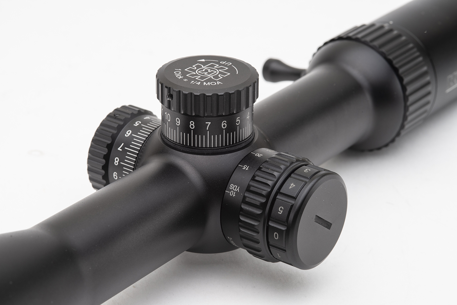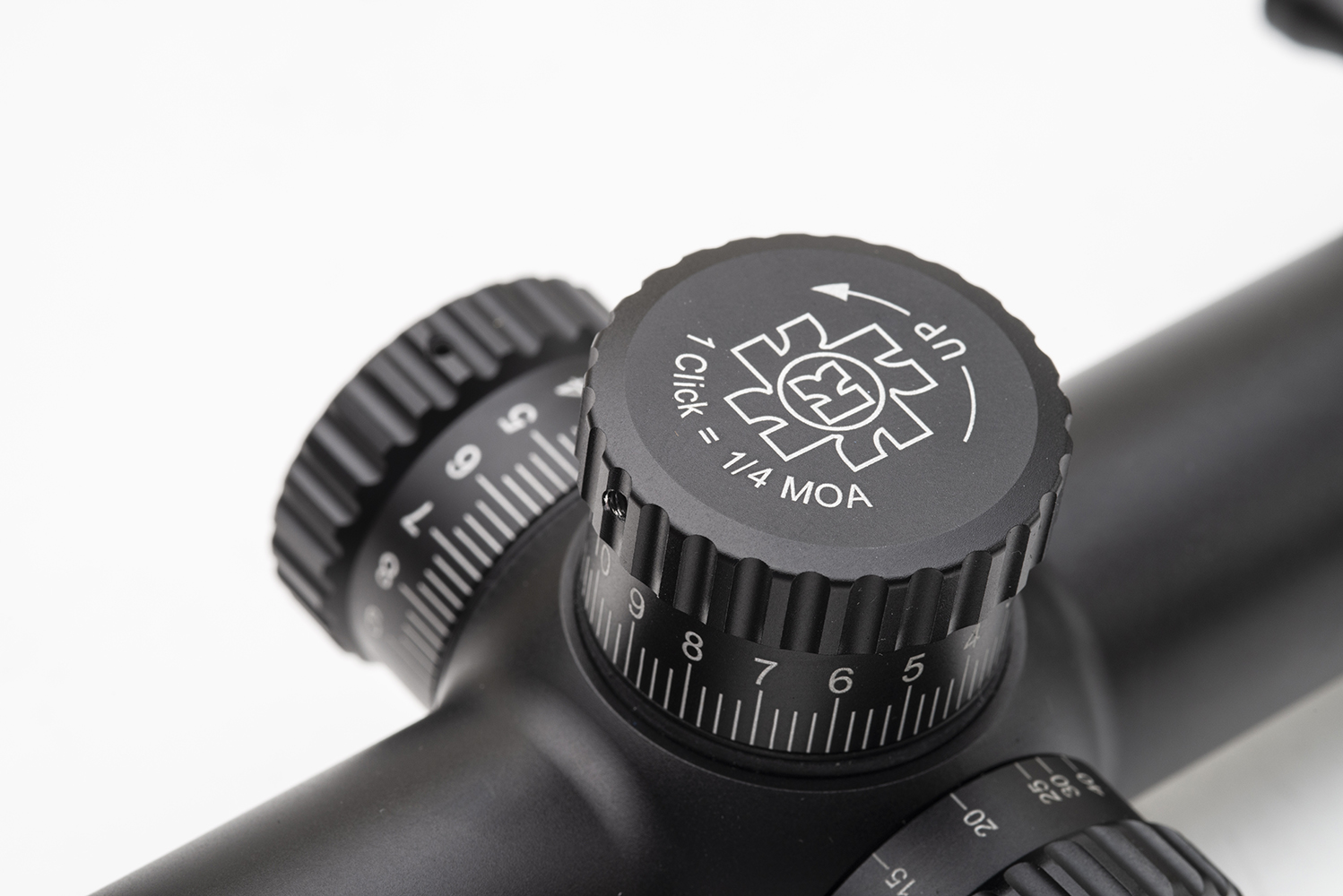 Le torrette per la regolazione del punto d’impatto modificano il reticolo a passi di un quarto di Moa all’interno di un intervallo di 90 Moa (sono quindi 360 click totali). Sono del tipo esposto: per essere regolate devono essere sollevate e non bisogna dimenticarsi di riportarle in posizione di blocco dopo la taratura del sistema-arma. Tre grani a brugola permettono inoltre l’azzeramento degli indici. Il tubo erettore, secondo quanto dichiarato dall’azienda, è di nuova concezione e garantisce maggiore affidabilità con i calibri più grossi e punitivi.