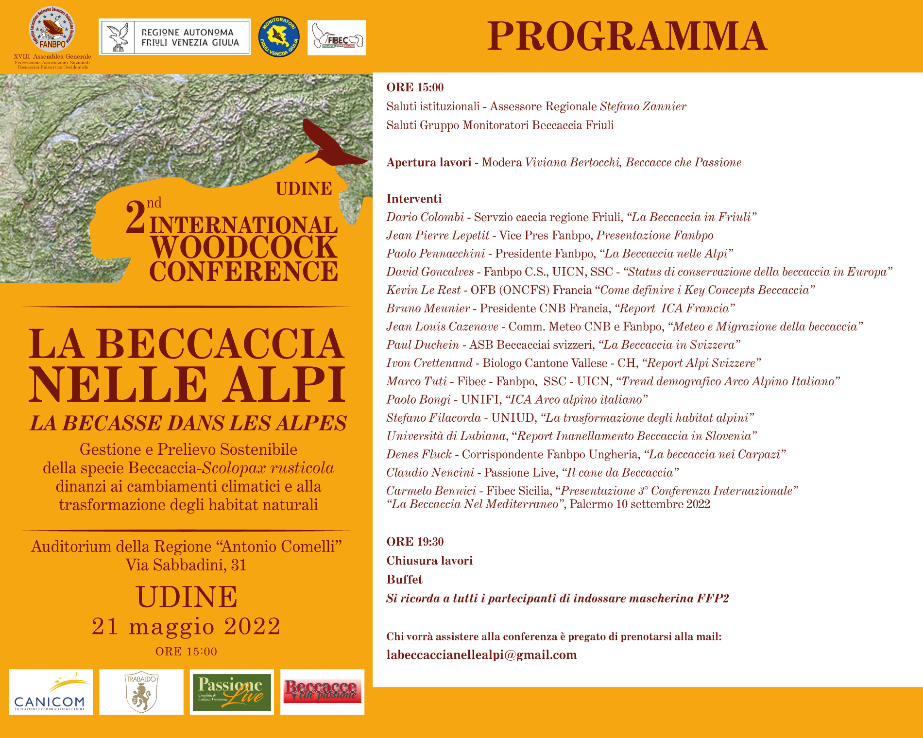La conferenza si svolgerà a Udine, sabato 21 maggio dalle ore 15 alle 19.30 presso l’Auditorium regionale in via Sabbadini 31. Si ricorda che l’evento è patrocinato e promosso dalla Regione Friuli Venezia Giulia in collaborazione con Fanbpo, Fibec Friuli V.G. e con il Gruppo monitoratori beccaccia formati dalla Regione.