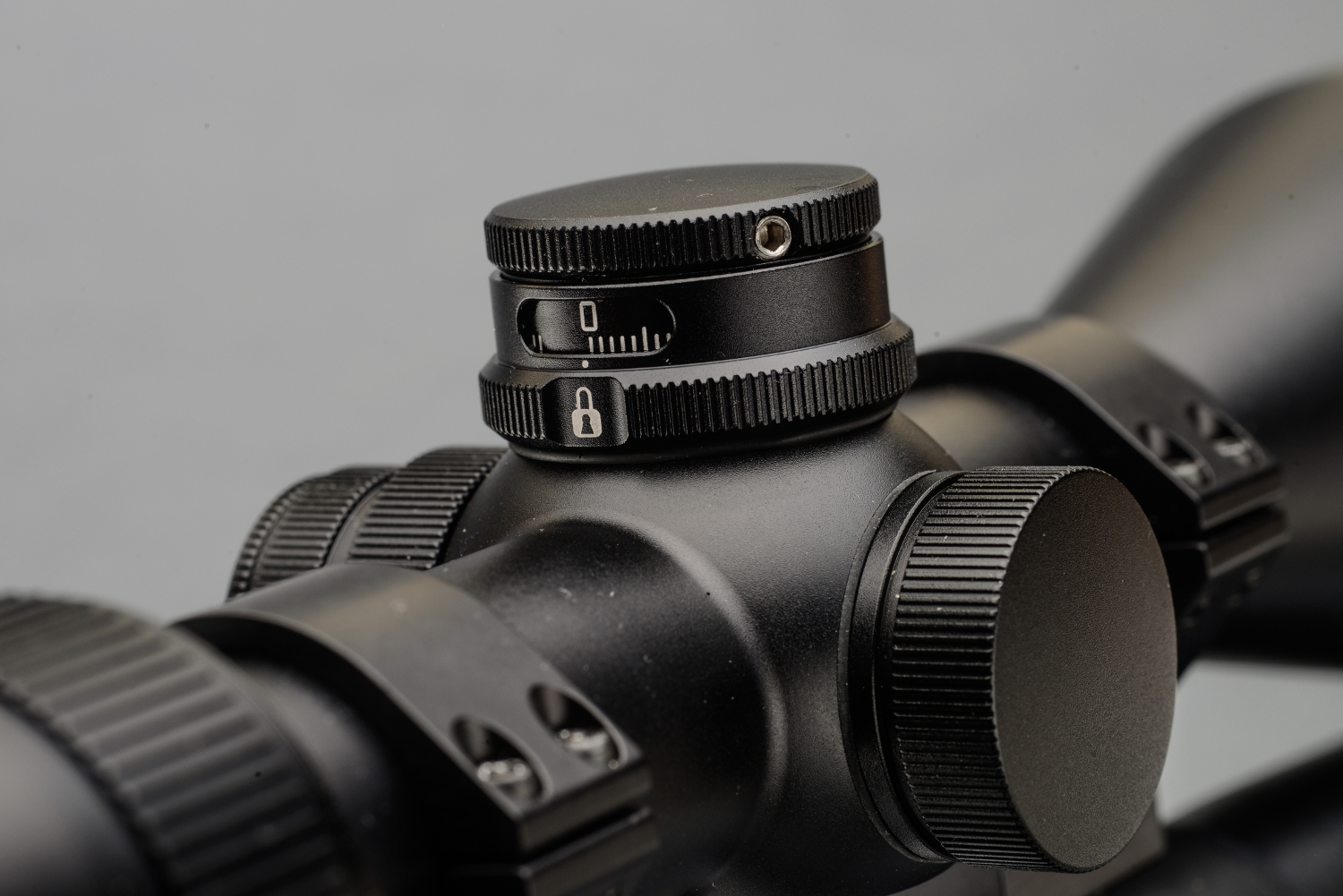 La ghiera esterna della terza torretta è deputata alla regolazione della parallasse. Permette così di porre sul medesimo piano focale tanto il reticolo quanto il bersaglio. Si tratta di un registro indispensabile su un’ottica destinata all’impiego in un range molto ampio di distanze, quale quello della caccia di selezione. Il campo di regolazione spazia tra i 50 metri e l’infinito. Il blocco a 100 metri favorisce la consapevolezza nella regolazione.