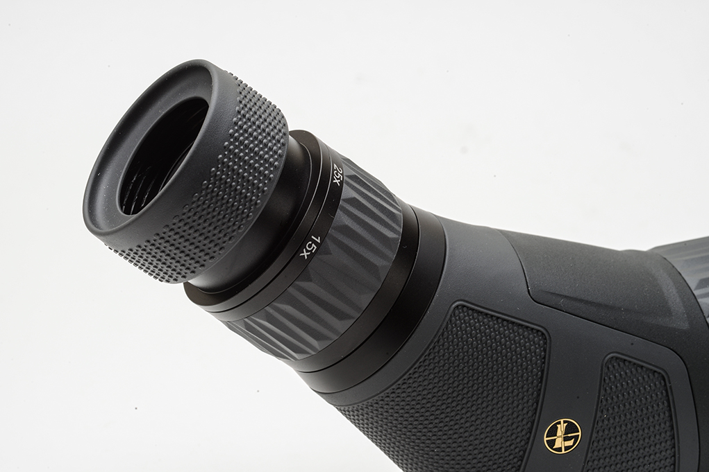 L’oculare, non sostituibile, è molto ben realizzato. Presenta la ghiera per la regolazione del rapporto d’ingrandimento e una buona conchiglia estraibile, anch’essa gommata, con quattro distinti punti di blocco. La messa a fuoco è resa possibile da un’altra ampia ghiera posta a metà del corpo del cannocchiale. Ha un movimento molto fluido che consente la regolazione fine del fuoco. In posizione anteriore alla stessa è posto l’anello che porta la base con il foro filettato necessario all’applicazione alla testa del treppiede; lo stesso permette la rotazione del cannocchiale quando le condizioni di osservazione lo richiedono. Un comando godronato, anch’esso gommato, permette di bloccare lo strumento nella posizione desiderata.