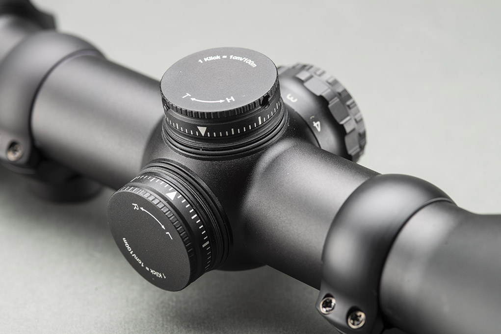 Manca la regolazione della parallasse, elemento spesso assente nelle ottiche intermedie, ma disponibile nell’ottica più estrema di questa gamma. Due coperchi dal profilo molto contenuto proteggono le torrette destinate alla regolazione di alzo e deriva. Gli interventi procedono a passi di un terzo di Moa, quindi un centimetro a 100 metri. La regolazione si estende su un intervallo di 200 centimetri a 100 metri (67 Moa) sia sull’asse verticale sia su quello orizzontale.