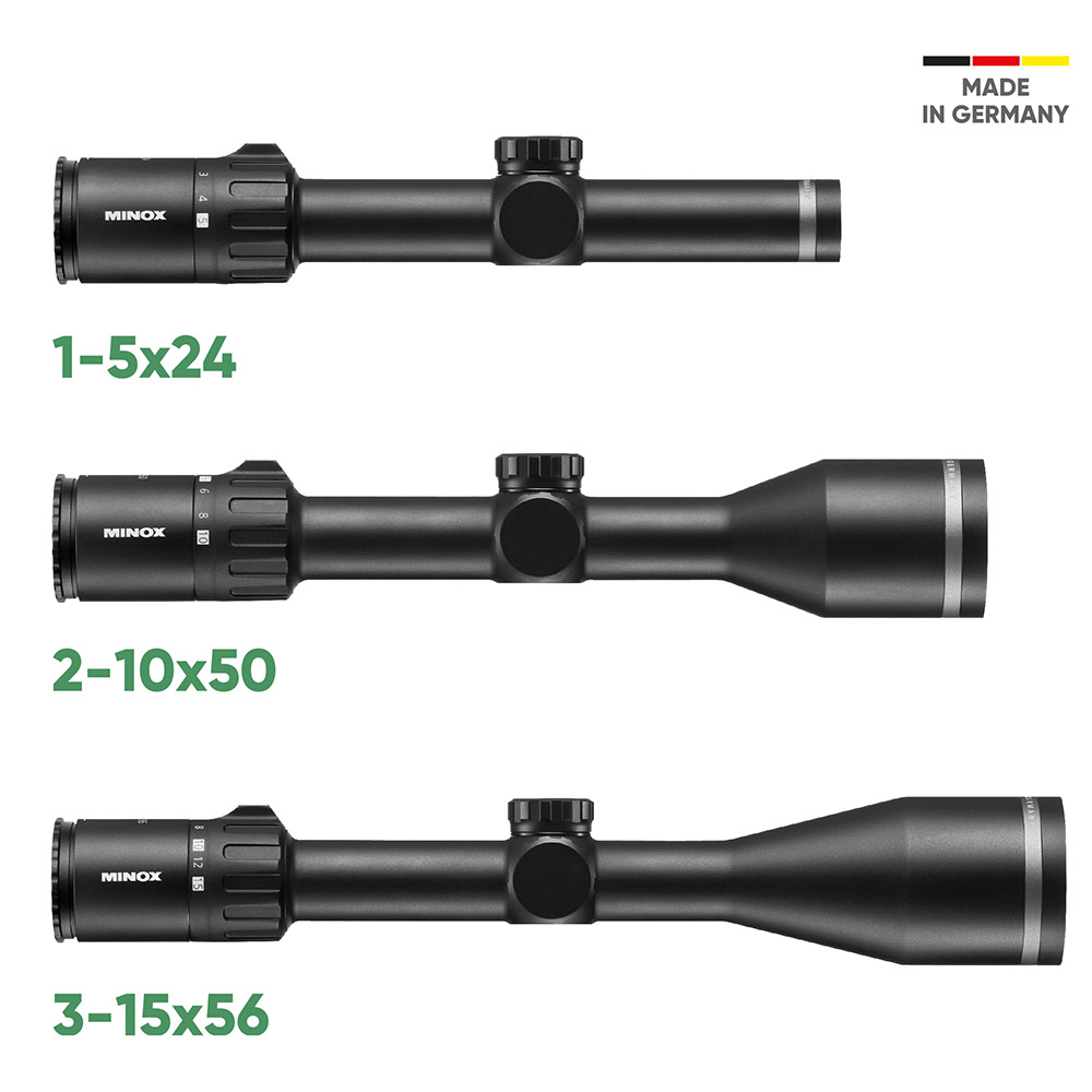 La gamma Minox All-rounder è composta da tre modelli (1-5×24, 2-10×50 e 3-15×56) disponibili anche in versione S con Z-rail. Grazie ai nuovi rivestimenti ottici M*plus, è caratterizzata da un livello di trasmissione luminosa che si spinge fino al 94%; risulta quindi molto performante anche nell’impiego crepuscolare. Il reticolo Glass Fiber Point #4, posto sul secondo piano focale, è illuminato per facilitare l’impiego con differenti livelli di luminosità ambientale. Un sensore di posizione disattiva il punto rosso quando l’arma non è in posizione d’ingaggio.