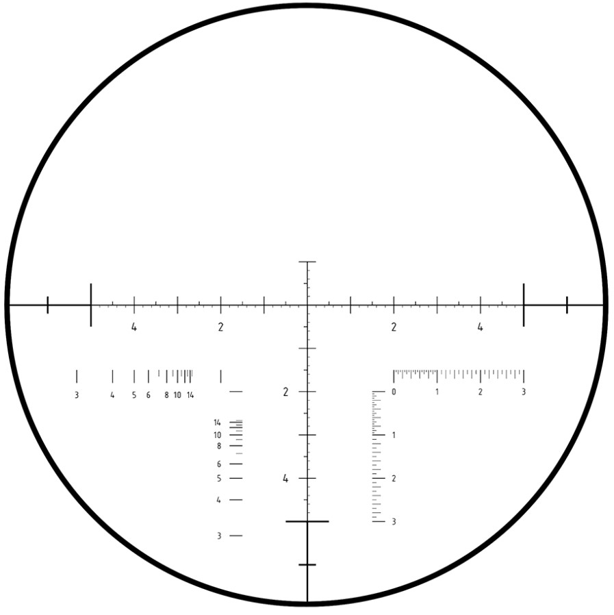 Il reticolo Mr2-S si trova sul primo piano focale e quindi mantiene costanti le proporzioni dei suoi riferimenti al variare degli ingrandimenti. Si tratta di un reticolo pensato principalmente per il tiro a lunga distanza e per impiego tattico, che può comunque trovare applicazione anche in ambito venatorio. A patto di saper leggere il reticolo nel modo corretto, infatti, lo strumento consente allo spotter di passare le informazioni di un eventuale correzione del tiro in modo chiaro, preciso e istantaneo al tiratore e consente di valutare la distanza d’ingaggio del bersaglio anche senza il supporto di un telemetro elettronico. I riferimenti presenti sono molto dettagliati e precisi, indicati in Mrad, con intervalli fino a 0,2.