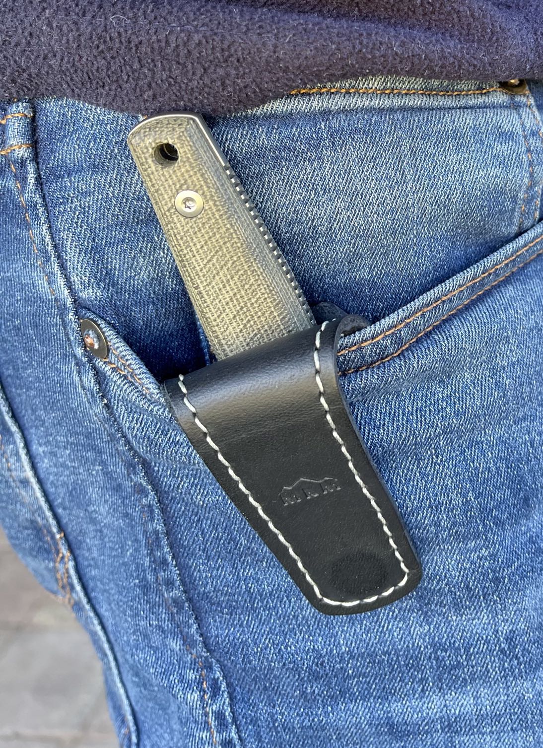 Quanto al porto è possibile affidarsi al fodero magnetico Mkm che consente di portare il coltello all’interno della tasca; in alternativa, è possibile acquistare il fodero in kydex (40 euro) con lacci in cuoio per il porto orizzontale in cintura o cordino per appenderlo al collo.
