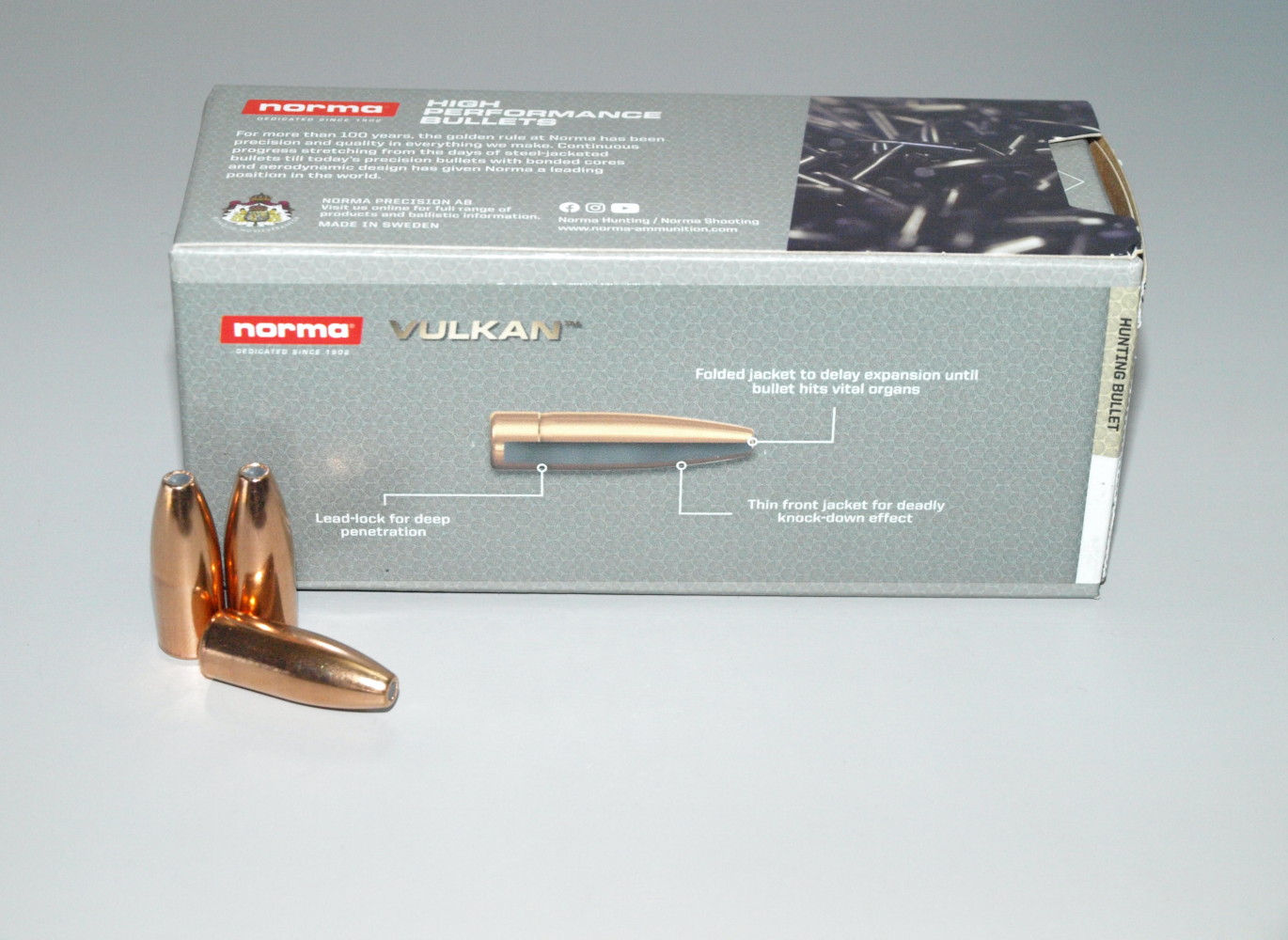 Il profilo apicale piano conferisce una forma che rende la palla assimilabile a una flat point. La overall length per la Vulkan in calibro 9,3 millimetri è di 26,10 millimetri. Sul numero di dieci palle esaminate (230,96; 231,00; 231,32; 231,06; 230,98; 230,42; 230,94; 230,59; 230,84; 231,04 grani) il peso medio rilevato è pari a 230,91 grani, con deviazione standard di 0,23 grani e uno scarto di 1,09 grani in difetto rispetto al peso dichiarato. La Norma Vulkan è molto popolare nonché spesso impiegata in Europa per cacciare selvatici di mole come cinghiale e cervo. È disponibile anche nei calibri 6,5 millimetri, .270, 7 millimetri, .30 e 8 millimetri.