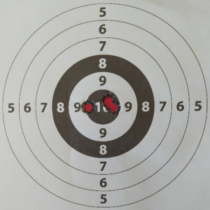 Per le prove in poligono si è fatto ricorso all’appoggio anteriore su rest. Le condizioni ambientali hanno lasciato rilevare una temperatura di 23 °C, umidità dell’49%, pressione di 1.018 millibar e vento da Nord-Est a velocità comprese tra 7 e 13 chilometri orari. Sulla linea di tiro, fissata alla distanza di 50 metri, ho sparato tre colpi e la distanza tra i centri dei due fori più lontani è risultata pari a 16 millimetri.