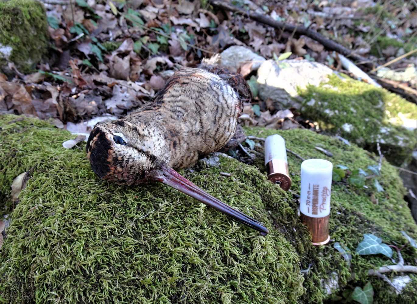 Non appena sciolti, i cani fermarono a pochi metri di distanza; piano piano s’avvicinavano al boschetto. Fra ferme e consensi la tiritera andò avanti almeno per una decina di minuti, quando sentii frullare la beccaccia alle mie spalle mentre i cani mi guardavano. Mi girai e, un istante prima che scomparisse dietro un alto cespuglio di rovi, lasciai partire il colpo. Azione conclusa con successo. Anche stavolta era stata furba, ma aveva sbagliato l’uscita di pochi metri. La cartuccia caricata con piombo numero 9, a una distanza di circa 20 metri, la fulminò.