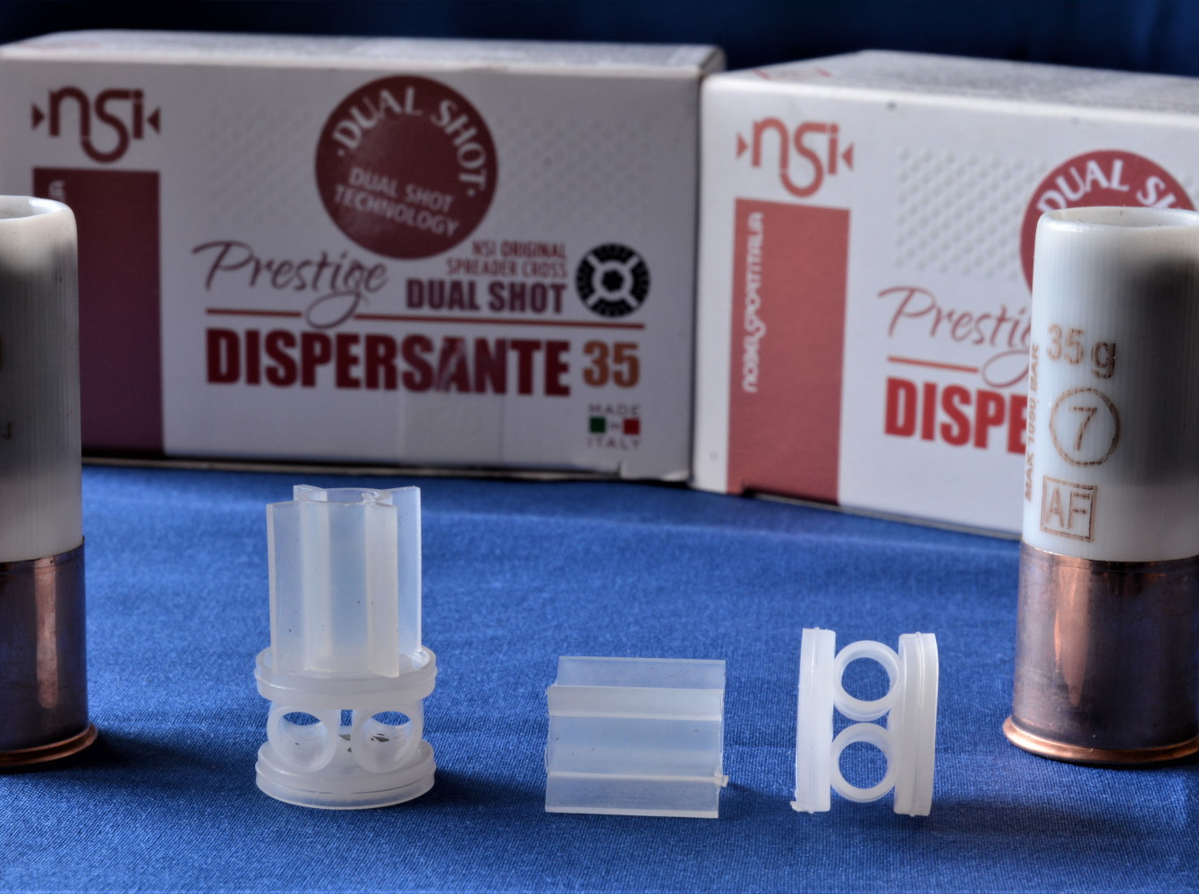 Sopra la borra Bior, il dispersore Nsi denominato Original spreader cross. La croce ha ovviamente un effetto dispersante; ma dal momento che non dispone di un contenitore un certo numero di pallini è albergato nel cilindro centrale. Lo scopo è quello di avere una dispersione elevata, ma di non creare buchi al centro della rosata, difetto che compare in diverse cartucce dispersanti, specialmente quando il tiro si allunga. L’altezza del dispersore si aggira sui 17,5 millimetri, per una larghezza del canale interno di circa 7,15 millimetri.