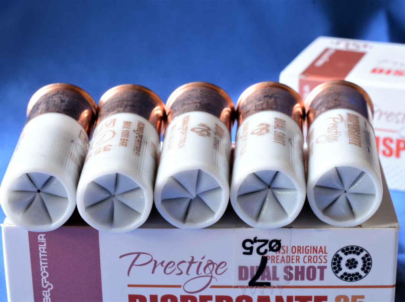 - Bossolo: 12/70 bianco latte con fondello tipo 4 di 23 mm, color rame