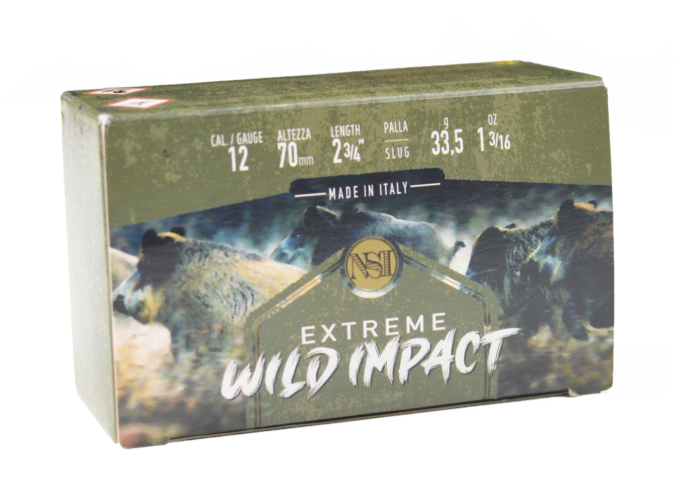 Nella parte frontale è raffigurato un branco di grossi cinghiali in corsa, con il nome della cartuccia, il logo dell’azienda e un esagono stilizzato, segno distintivo del rebranding di Nsi. Sulla scatola si nota anche il disegno della palla Pss, oltre ovviamente ai dati relativi al calibro, alla lunghezza del bossolo e al peso della palla.