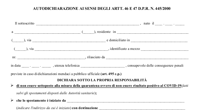 Chi l’aveva già stampata ha buttato via l’inchiostro: oggi pomeriggio il Viminale ha diffuso il modulo su cui compilare la nuova autocertificazione per gli spostamenti. Rispetto alle scorse inserisce un riferimento alle eventuali “ulteriori limitazioni disposte con provvedimenti” regionali, un doppio spazio per gli indirizzi di destinazione e di partenza e specifica i motivi per i quali è consentito spostarsi alla luce dell’ultimo decreto legge e della circolare del 23 marzo.