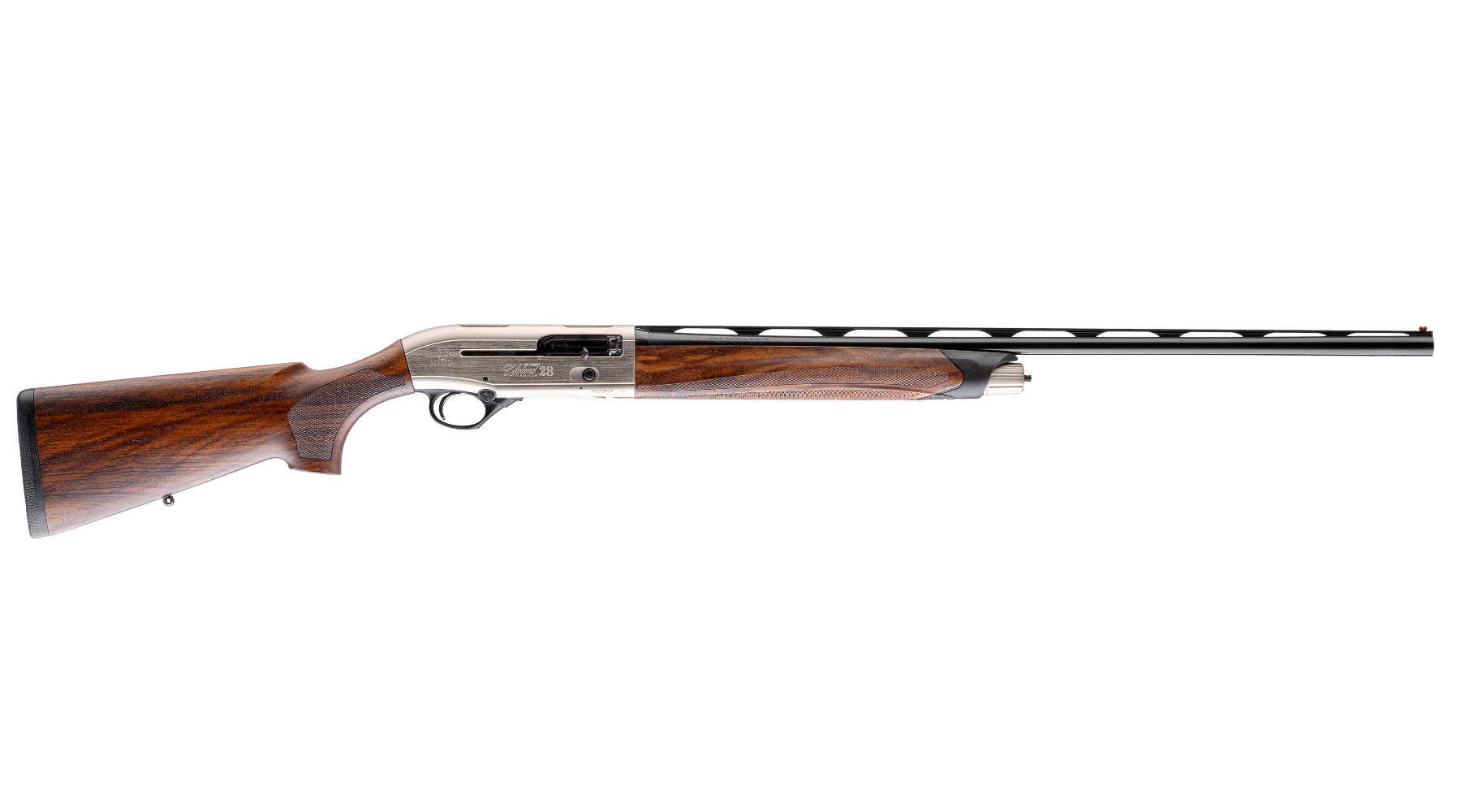 Calcio e astina in legno di noce e carcassa nichelata, il fucile semiautomatico Beretta A400 Upland è ora disponibile anche in calibro 28 magnum.
