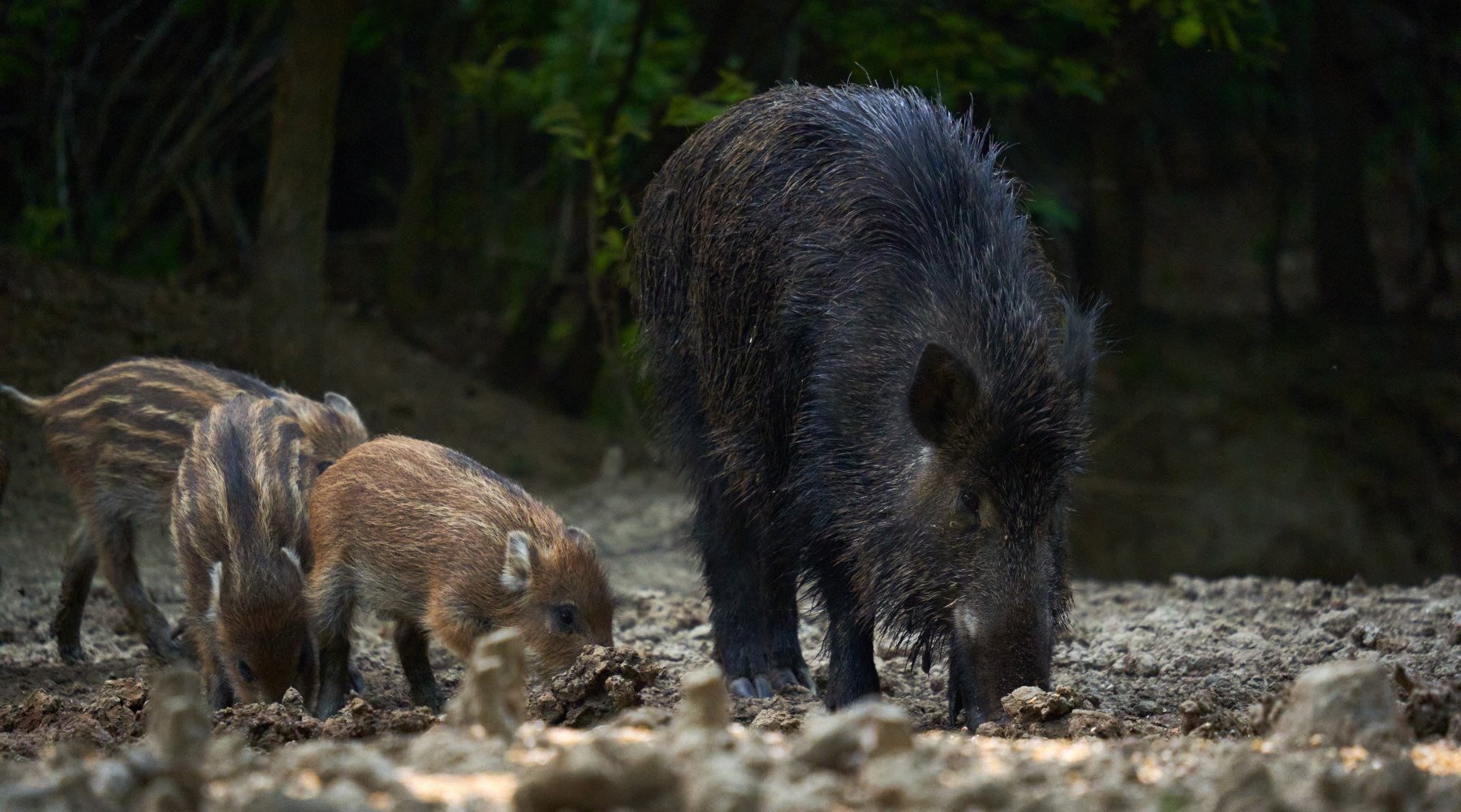 Peste suina africana in Italia: cinghiale adulto con piccoli mangia nella foresta