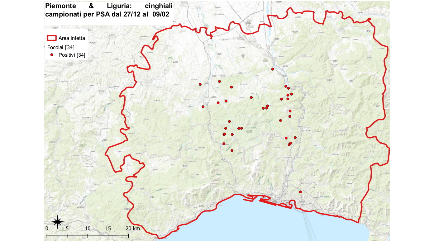 Diciassette in Piemonte e diciassette in Liguria: sono trentaquattro i casi di peste suina africana registrati al momento in Italia. L’ultimo è stato accertato l’8 febbraio a Rocca Grimalda, in provincia di Alessandria, sempre all’interno dell’area infetta; la cartina diffusa dall’Istituto zooprofilattico sperimentale consente di identificarne il perimetro e di capire in quali zone si concentrino le carcasse infette.
