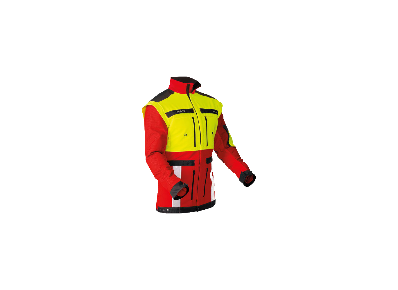 La giacca con tessuto superiore è estremamente resistente agli strappi, tanto da non sentire le spine. Le tecnologie StretchAir e KlimaAir garantiscono ottimale aerazione e massima libertà di movimento; sulla schiena si trovano le zone per l’aerazione e il passaggio del sudore. Il collo alto chiudibile evita la penetrazione di aghi di pino o altro sporco nella giacca. La tasca pettorale è fornita di linguetta e occhiello per il nastrino di segnalazione; le strisce riflettenti garantiscono visibilità nel bosco.