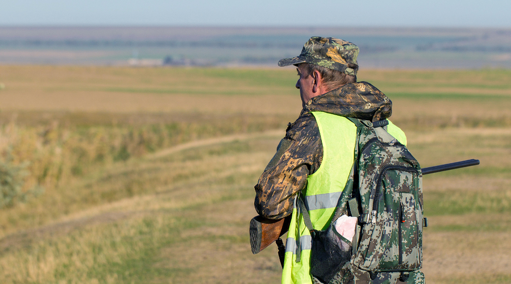 Proroga delle scadenze venatorie in Lombardia: cacciatore di spalle in alta visibilità, zaino sulle spalle, fucile in mano