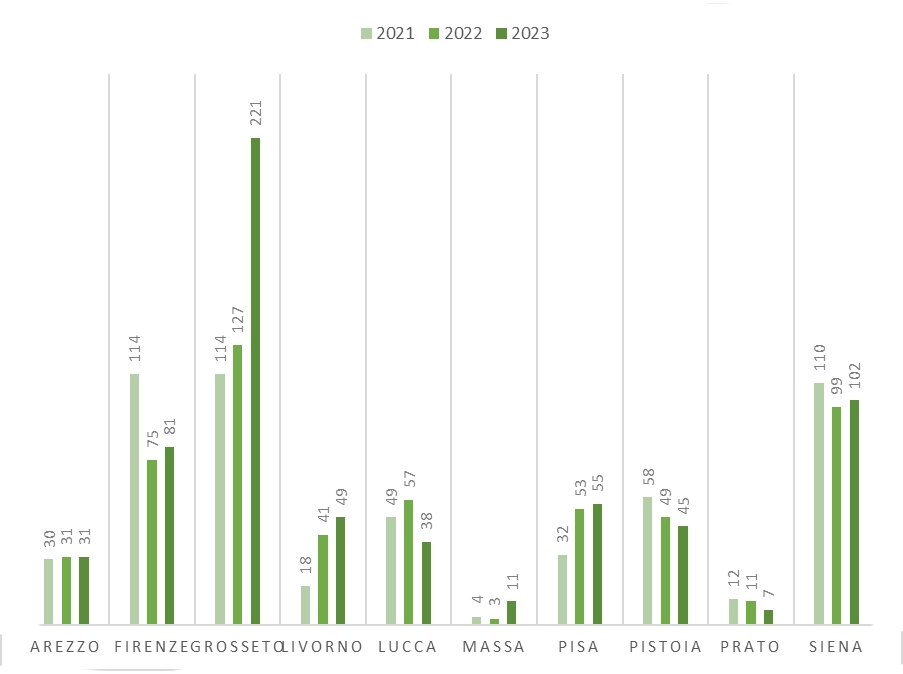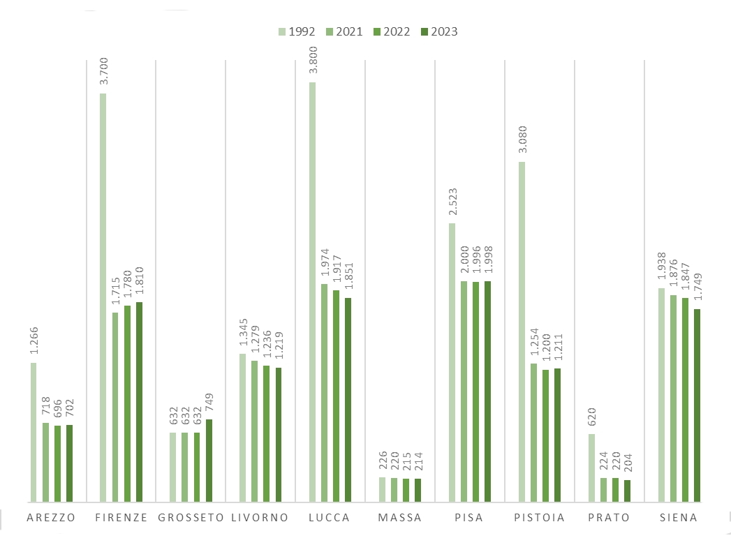 Dalla delibera con cui la giunta regionale della Toscana ha proposto il nuovo piano faunistico-venatorio s’apprende che dai 19.130 previsti come limite massimo dalla legge nazionale sulla caccia, che fotografava la situazione del 1992, si è scesi agli 11.707 del 2023; la perdita dunque è pari al 38,8%.