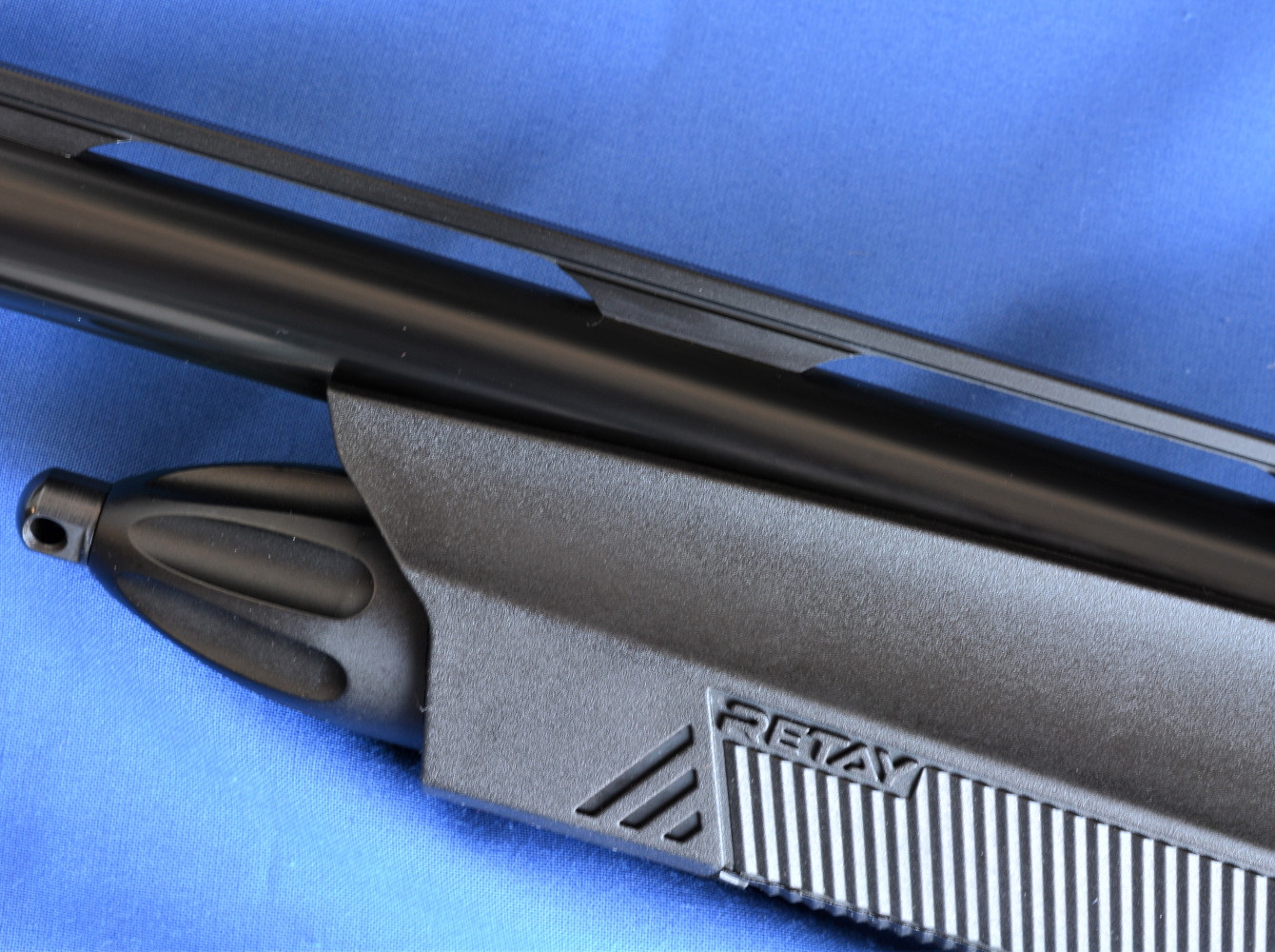 Su impugnatura e astina è stato ricavato uno zigrino particolare, formato da una serie di linee parallele alla superficie di appoggio della coccia; non è male, il design si integra sufficientemente bene con il resto dell’arma. Da verificare, come sempre, la resa operativa, magari in quelle belle giornate uggiose. Sulla coccia compare la scritta “Retay” a ricordare l’identità aziendale.