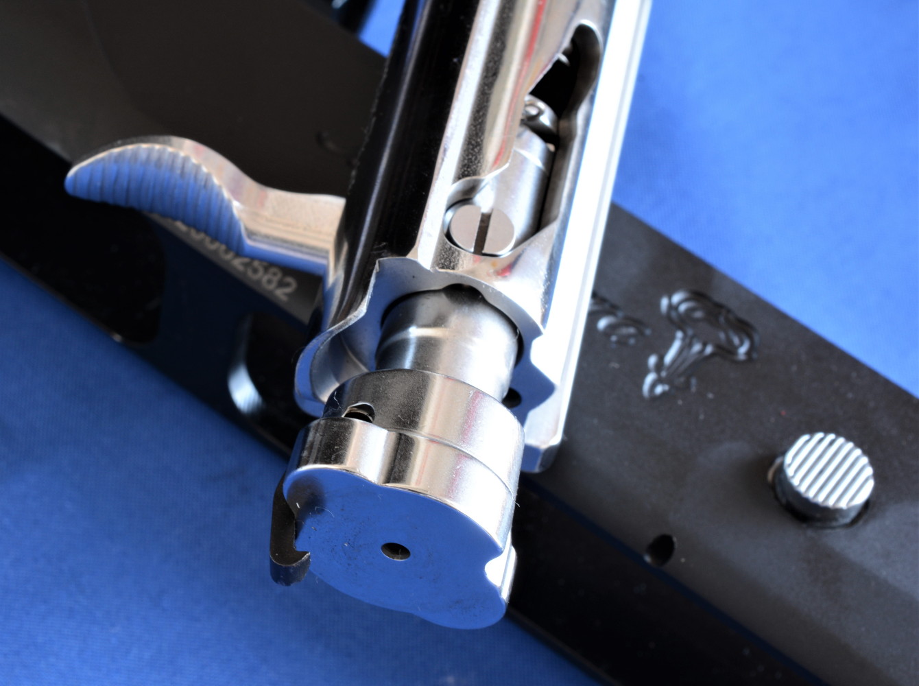 Sul prolungamento di canna, che altro non è che l’upper receiver o fodero, si nota l’espulsore a pistoncino che volendo si può smontare e pulire. L’ejector è costruito in acciaio per una migliore resistenza all’usura. La canna è testata a 1.500 bar; anche se dal punto di vista pratico poco o nulla cambia, guardiamo con interesse al tentativo sempre più diffuso di fornire un messaggio di sicurezza (ovviamente imprescindibile dalle norme usuali). Il consiglio rimane sempre quello di non esagerare mai con le eventuali cartucce ricaricate e di affidarvi primariamente al responso di un Banco di Prova ufficiale prima di lanciarvi in test spregiudicati.