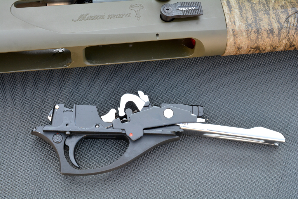 Prima di accennare qualche cosa sul cinematismo, appare doveroso citare un’altra feature del Masai Mara. Con un semplice movimento è infatti possibile rimuovere l’intero gruppo di scatto. È sufficiente – a cane armato – premere il piccolo pulsante rotondo e zigrinato situato alla base del ponticello (lato destro) e tirare verso il basso: il gioco è fatto. Per rimontare il tutto, è sufficiente inserire il gruppo scatto nel suo alloggiamento, avendo cura di premere anche il pulsante di rilascio otturatore per impedire qualsiasi ostacolo dovuto alla leva discesa cartucce. È un’operazione semplice e veloce, da compiere rigorosamente con il fucile scarico e che pone una riflessione.