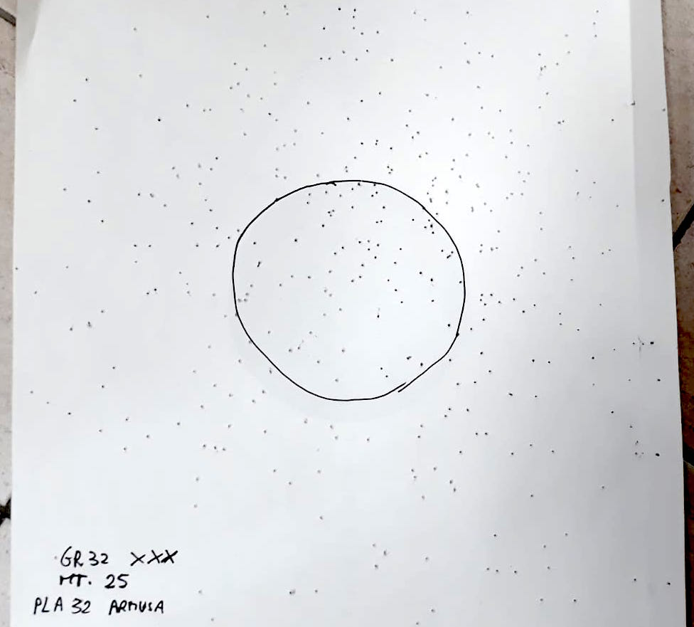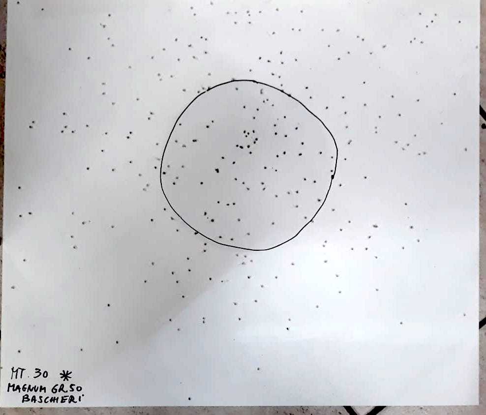 Per non rinunciare a mostrarvi una rosata, stante l’impossibilità di fare una prova in placca, abbiamo rimediato artigianalmente. Abbiamo preso un foglio, tracciato (molto male) un cerchio di circa 18 centimetri di diametro e abbiamo sparato a 25 e a 30 metri con strozzature rispettivamente tre stelle e una stella una cartuccia Armusa da 32 grammi di piombo e una magnum da 50 grammi di piombo Baschieri & Pellagri. Va da sé che questa prova è solo indicativa, ma fornisce un’indicazione visiva di quello che è il rendimento balistico della canna del Masai Mara. E, alla luce dei fatti, direi anche che si tratta di un buon risultato.