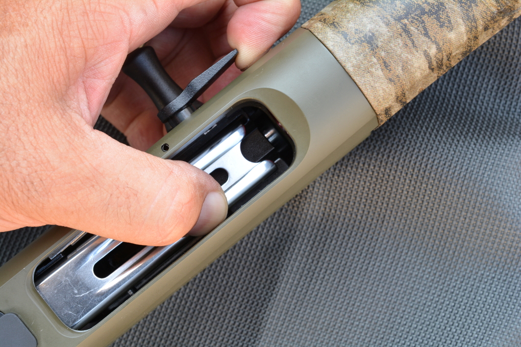Più particolare il tiretto di armamento e il pulsante di sgancio otturatore, che risultano di dimensioni maggiorate. Il pulsante di sgancio otturatore, in alluminio zigrinato, riporta il nome aziendale, mentre il tiretto ha una forma particolare; una specie di clessidra senza zigrinature di sorta ma che risulta comodo nell’uso. Per dimensioni e forma, entrambi i comandi presentano forti analogie con quelli dei fucili destinati alle competizioni di tiro dinamico ma risultano utili anche nella caccia, specialmente quando si opera in velocità o fa freddo. Tra l’altro la levetta di chiusura otturatore serve anche come leva discesa cartucce.