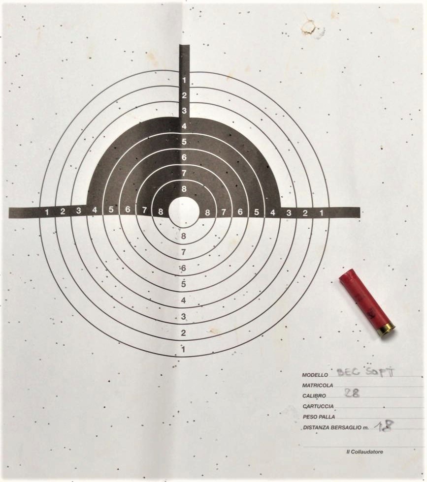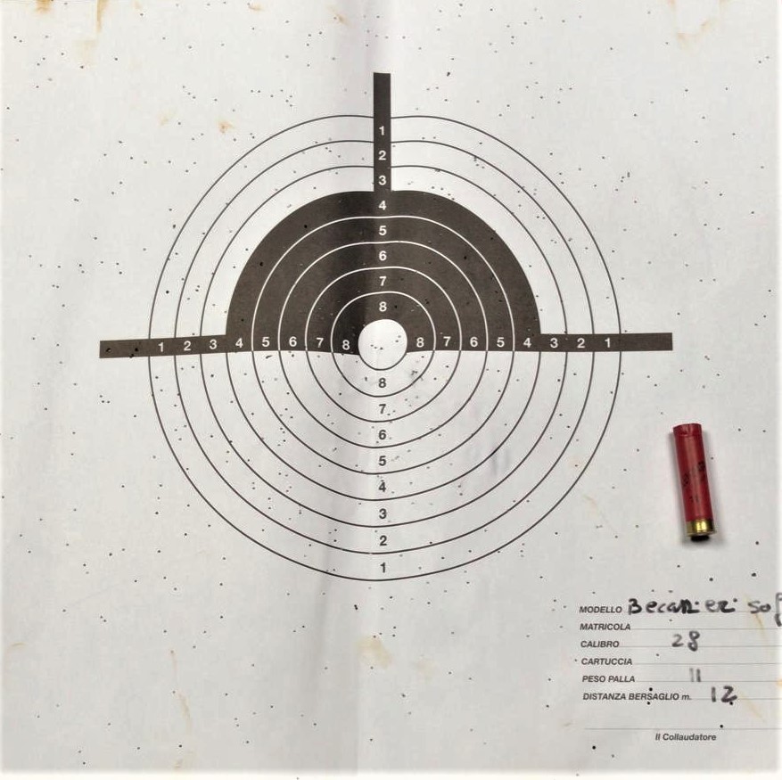 Siamo andati a testare la balistica offerta dalle canne del Bécassier Soft calibro 28 presso il poligono di Gardone Val Trompia, sparando a 12 e a 18 metri con le due canne skeet del fucile. La cartuccia utilizzata è stata la Fiocchi PL caricata con 17 grammi di piombo numero 11 e i risultati sono stati decisamente incoraggianti circa la possibilità di utilizzare l’arma con efficacia nel folto di un bosco.